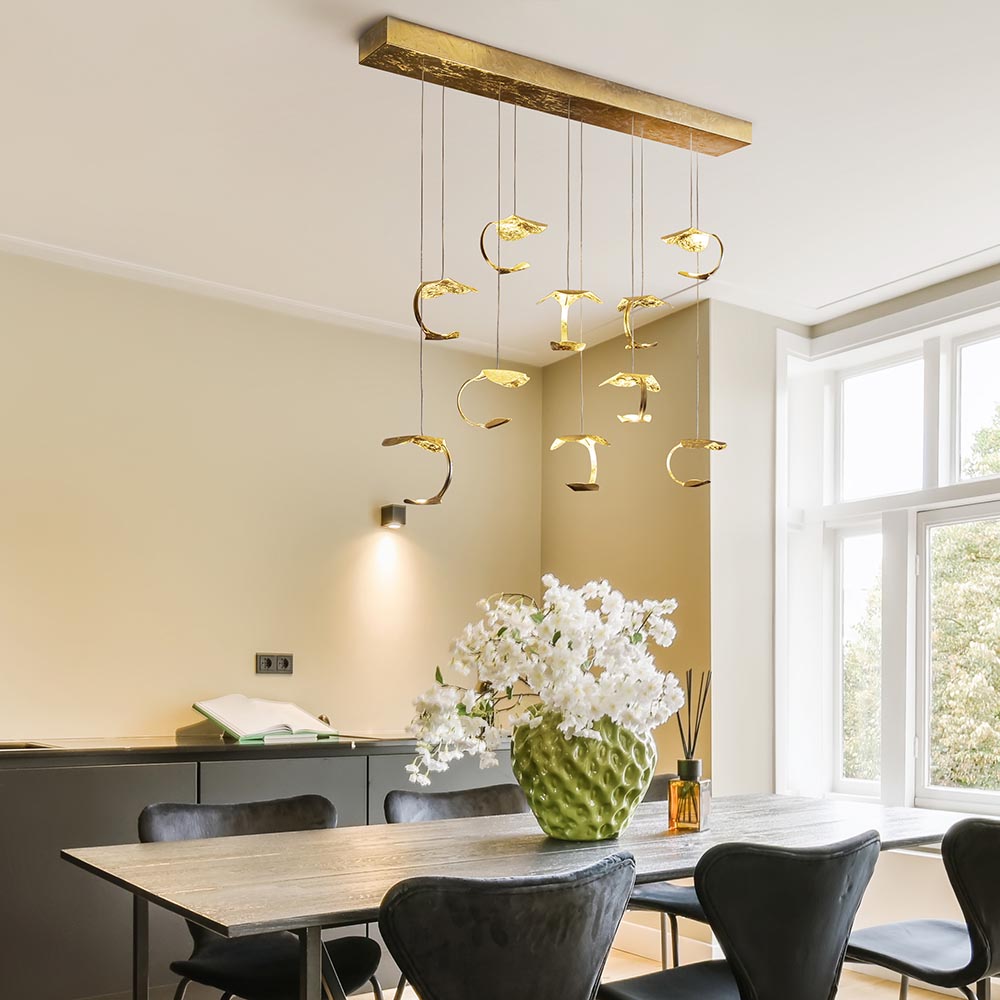 Deze prachtige design hanglamp is een verrijking voor het interieur. De 10-lichts hanglamp is gemaakt van metaal en voorzien van een goldleaf coating. Dit geeft de lamp een chique en luxe uitstraling. De lamp wordt aan het plafond bevestigd met een balk van 120 cm. Over de balk zijn 10 snoeren verdeeld die naar wens op hoogte zijn te hangen. De maximale hoogte is 130 cm. De 10 kappen zijn voorzien van LED verlichting en geven een indirecte verspreiding. Met 850 lumen per kap zorgt de lamp voor voldoende licht. De LED designlamp is dimbaar middels de juiste dimmer (exclusief).