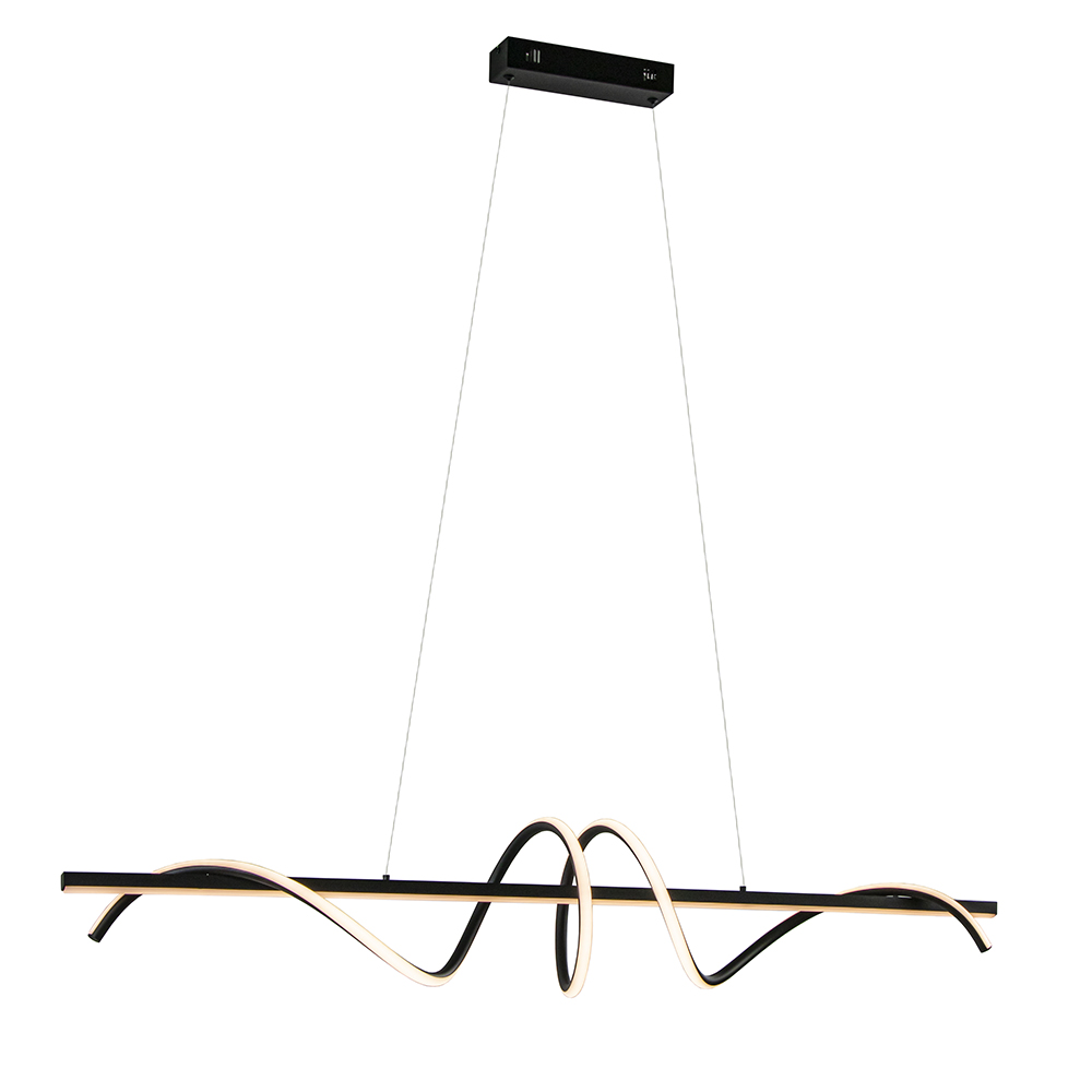 Leuke speelse LED hanglamp voor boven de eettafel, kookeiland of bureau. De rechte balk zorgt voor direct licht naar beneden en de krul zorgt voor breed licht. Waardoor de hanglamp rondom licht geeft, heel functioneel dus. De hanglamp heeft een hoge lichtsterkte, 2150 lumen. Heeft u een LED dimmer aan de wand, dan kunt u deze zwarte hanglamp uitstekend toepassen aangezien de techniek geschikt is om te dimmen. Hierdoor kunt u de hanglamp in elke sfeer instellen. Geen dimmer maar een schakelaar, dan kunt u deze altijd nog vervangen voor een LED dimmer.