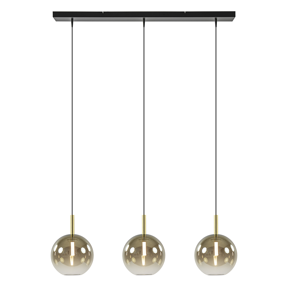 – afm: 104x24x155 cm – bevestiging: 100x8x3,5 cm – kappen: Ø24 cm – metaal, mat zwart/goud – glas, gold fading – inclusief LED – 3x 450 lumen – 2700-2200 Kelvin – dim to warm (exclusief) – in hoogte verstelbaar