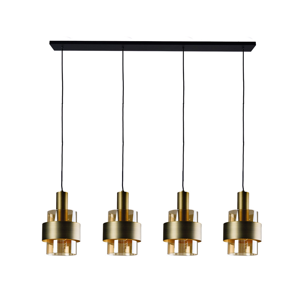 Voeg een vleugje luxe en elegantie toe aan je interieur met deze stijlvolle 4-lichts hanglamp. De lamp combineert een moderne vormgeving met warme materialen: het bronskleurige armatuur en de amberkleurige glazen kappen zorgen voor een sfeervol lichtbeeld en een chique uitstraling. Perfect boven een eettafel of kookeiland! Deze hanglamp bestaat uit vier identieke pendels aan een strakke, zwarte plafondbalk. Elke pendel heeft een cilindervormige glazen kap in een warme amber kleur waar een bronze kap omheen hangt, die samen een gelaagd en warm lichteffect creëren. De hoogwaardige afwerking en het gebruik van duurzame materialen maken deze lamp niet alleen een lust voor het oog, maar ook een waardevolle toevoeging aan elk interieur.