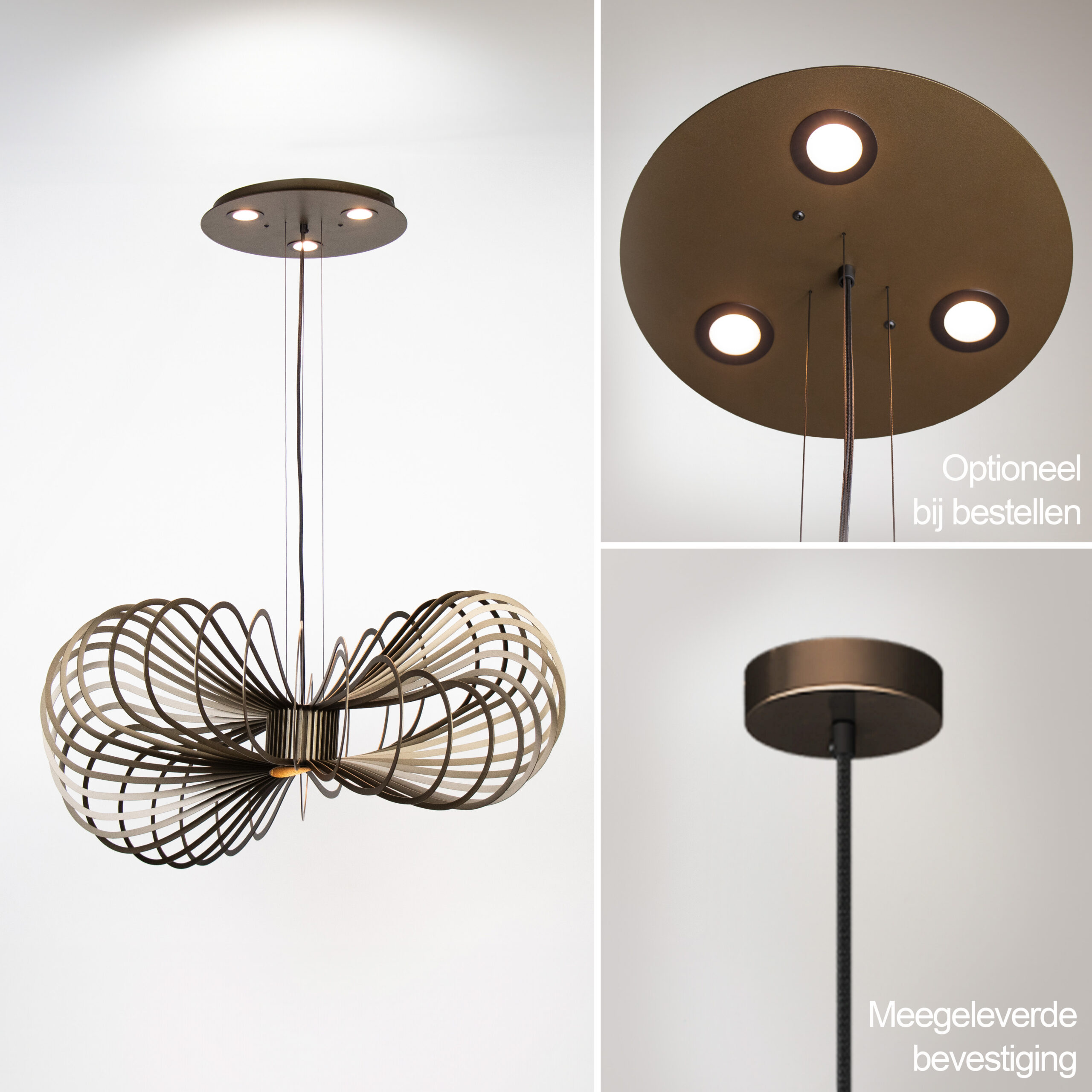 Deze bijzondere hanglamp heeft een abstract en uniek design wat hem een echte eyecatcher maakt. Het design geeft een speels effect wat ervoor zorgt dat de lamp er uit iedere hoek anders uit ziet. De lamp is gemaakt van metaal en uitgvoerd in de kleur platinum. Naast deze pluspunten qua vormgeving is de lamp ook nog eens uitgevoerd met de nieuwste Dim to Warm ledspots. Deze geven elk 550lumen lichtopbrenst.