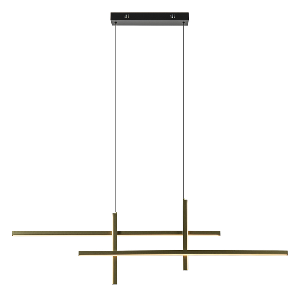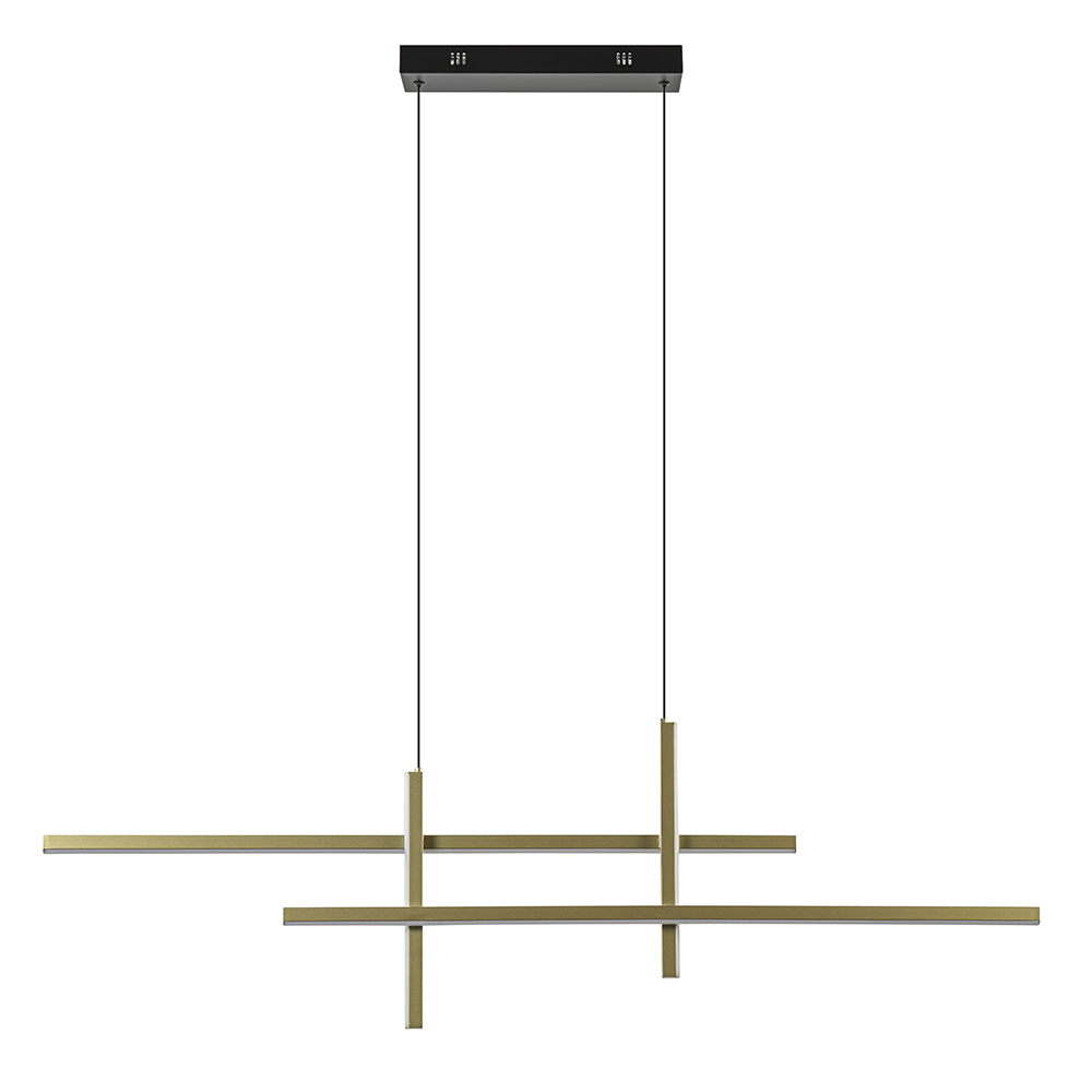Hanglamp Mikado heeft een strak design met een minimalistische look en feel. De moderne LED hanglamp heeft een metalen armatuur dat is uitgevoerd in het zwart met goud. De kap is samengesteld uit 4 losse balkjes die samen het geheel vormen. De horizontale balken zijn aan de onderzijde voorzien van een LED strip en de verticale beide aan de zijkant. Zo verspreid de hanglamp het licht mooi door de ruimte en is er vooral onder de lamp een goede belichting. Ideaal voor boven een eettafel, kookeiland of bureau. De strakke hanglamp geeft met 2700 Kelvin warm wit licht en is dimbaar middels een externe dimmer (exclusief).