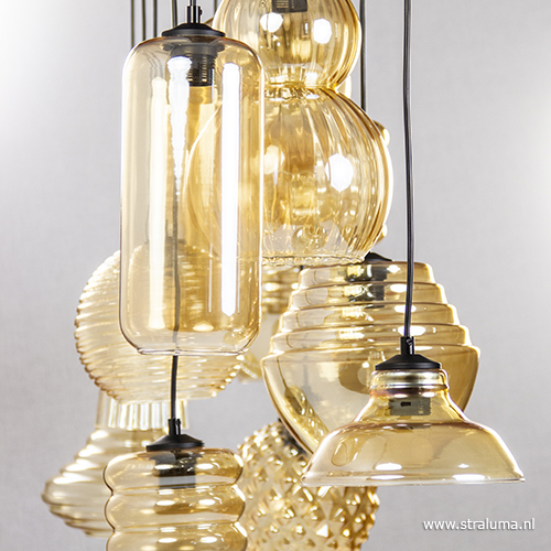 / Lampen / Eettafellampen / Hanglamp multipendel 14x amber glas/zw