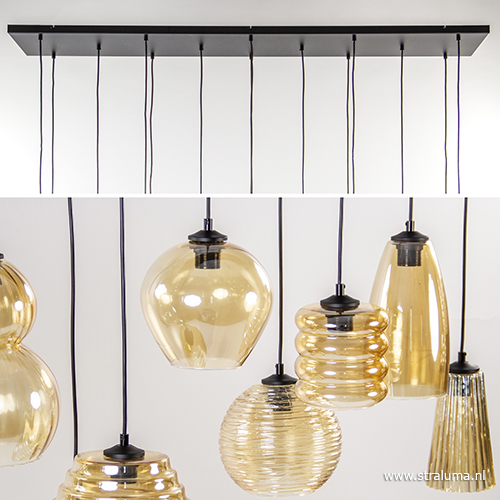 – lamp heeft een hoogte van 150 cm (verstelbaar) – 12 verschillende glazen kappen – zelf samen te stellen – plafondplaat heeft een afmeting van 160 x 25 x 3 cm – exclusief lichtbronnen (14x E27, geschikt voor LED)