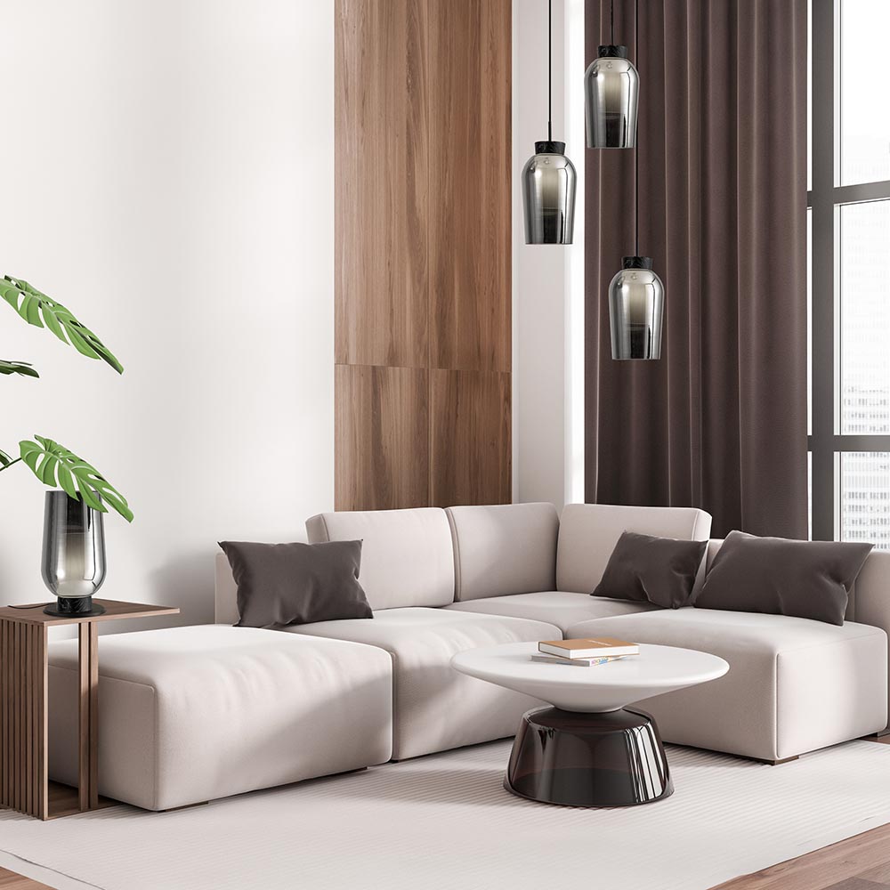 Een moderne hanglamp met een luxe uitstraling. Deze 3-lichts hanglamp heeft 3 sierlijke smoke glazen kappen. Ieder smoke glas heeft een wit binnen glas wat de hanglamp een mooi effect geeft als de verlichting aan staat. De combinatie tussen het smoke glas en het witte binnen glas geeft de hanglamp een sierlijke uitstraling. De fittingen van de hanglamp hebben een zwart marmer effect. De hanglamp is gemakkelijk in hoogte te verstellen en is dimbaar middels een externe dimmer (exclusief).