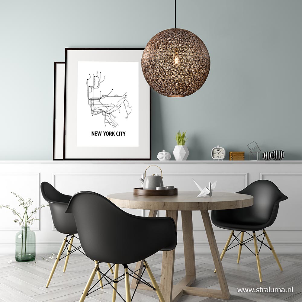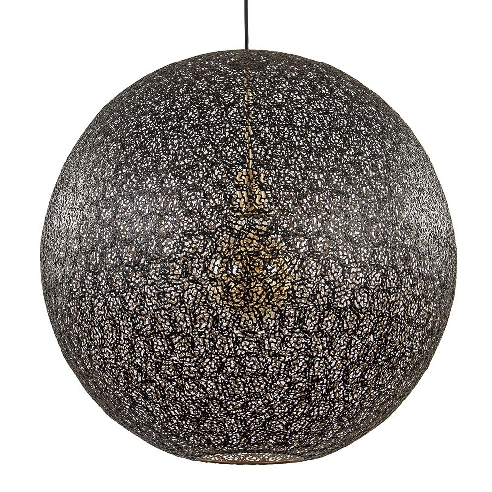 Modern met een chique uitstraling. Deze grote hanglamp is gemaakt uit kleine metalen deeltjes die samen de ronde kap vormen. De deeltjes zijn mat zwart aan de buitenzijde en goud aan de binnenzijde. Hierdoor krijgt de grote bol een luxe uitstraling en tevens zorgt het goud voor een warme sfeervolle verlichting. Het goud is doorgetrokken in de fitting binnenin de kap om het geheel af te maken. De metalen bol van maar liefst 60 cm hangt aan een zwart stof omwonden snoer en wordt met een metalen bevestiging aan het plafond opgehangen. Het snoer is naar wens in te korten zodat u de lamp overal kunt ophangen. Door z’n grootte past de lamp mooi boven een grote ronde tafel of maak een statement met twee naast elkaar boven een langwerpige tafel.