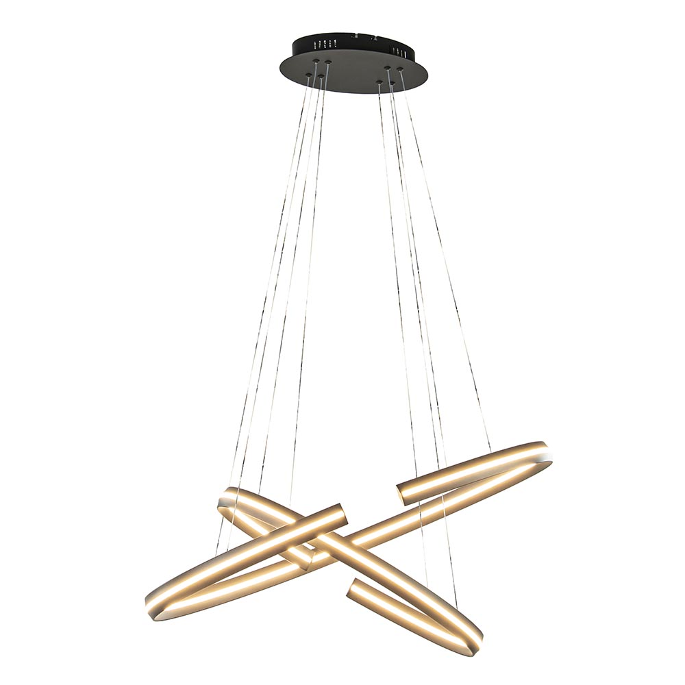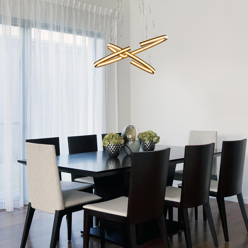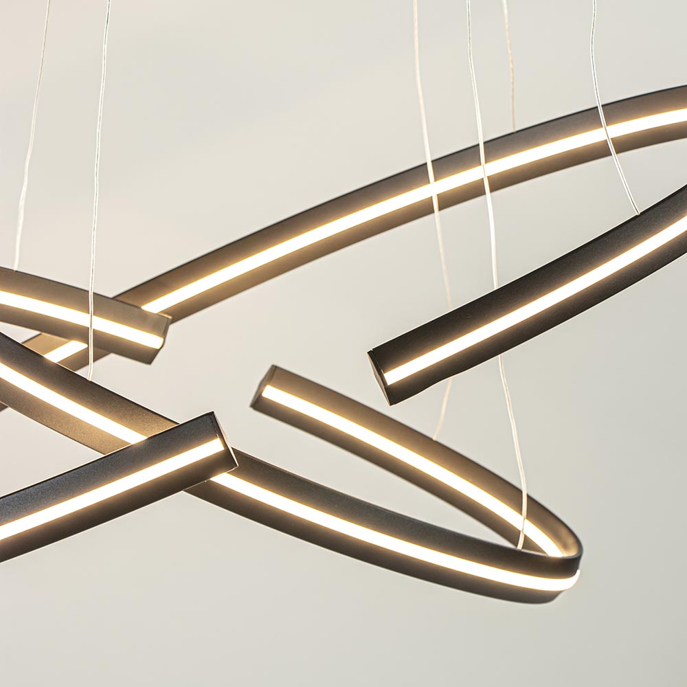 Een mooie eye-catcher voor de eettafel of in het kantoor. Deze ovale hanglamp bestaat uit twee ringen die beide aan de binnen- en buitenzijde zijn voorzien van LED strips. Door de dubbele LED strips geeft de moderne hanglamp een goede lichtverspreiding, en door 2700 Kelvin geeft deze ook sfeervol warm wit licht. De ovale ringen hangen aan dunne staaldraden die naar wens zijn in te korten. De lamp heeft een design die op meerdere manieren is op te hangen. Zo kunnen de ringen gekruist hangen maar ook recht onder elkaar. Creëer uw eigen hanglamp door te spelen met de staaldraden en geniet van een sfeervol design. De lamp wordt met een ovale bevestiging aan het plafond opgehangen en is dimbaar dmv een externe dimmer (exclusief).