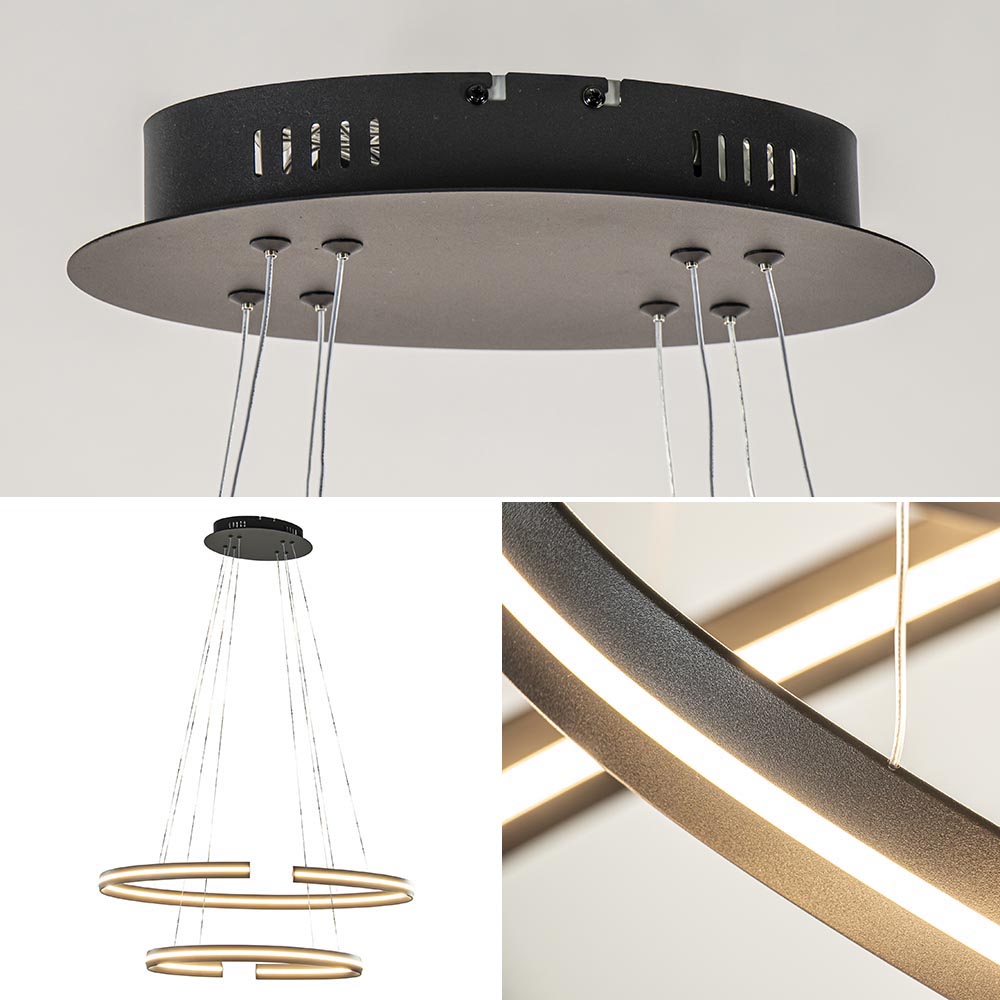 – hoogte: 120 cm (verstelbaar) – afm. ring 1: 80x42x4 cm – afm. ring 2: 60x28x4 cm – bevestiging: 25x13x5 cm (afdekplaat 30×18 cm) – inclusief LED – warm wit – 2700 Kelvin – 2700 lumen – zwart – dimbaar (exclusief)