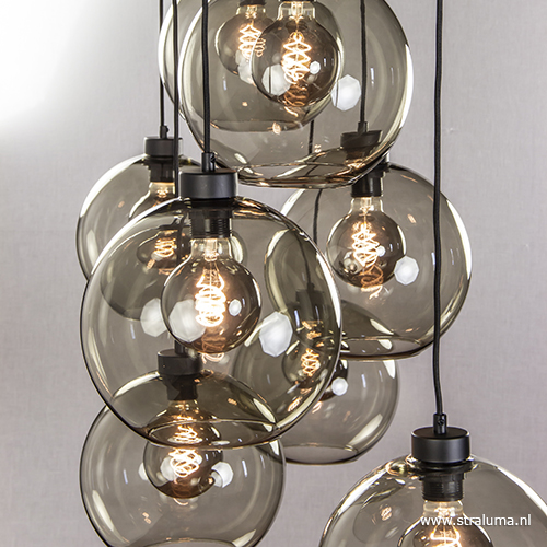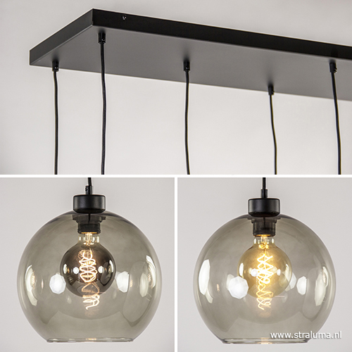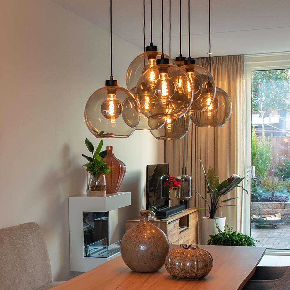 Wauw, dit wilt toch iedereen boven zijn eettafel hebben hangen?! Helemaal binnen de trends van nu en ook nog eens alleen bij ons te verkrijgen. Deze grote 8-lichts hanglamp maakt uw eetkamer helemaal af. De moderne lamp is voorzien van acht smoke/antraciet glazen kappen die hangen aan een zwart stof omwonden snoer. Wat leuk is aan de kappen, is dat deze naar wens op hoogte zijn te hangen. U kunt zelf bepalen welke hoog en welke laag komt te hangen en door het lange snoer past de lamp boven iedere tafel. Groot onderdeel van de lamp is de metalen mat zwarte plafondplaat. Deze springt direct in het oog in huis. De hanglamp is dus een echte eye-catcher. Het is wel van belang een juiste lichtbron te kiezen voor het maken van de juiste sfeer.