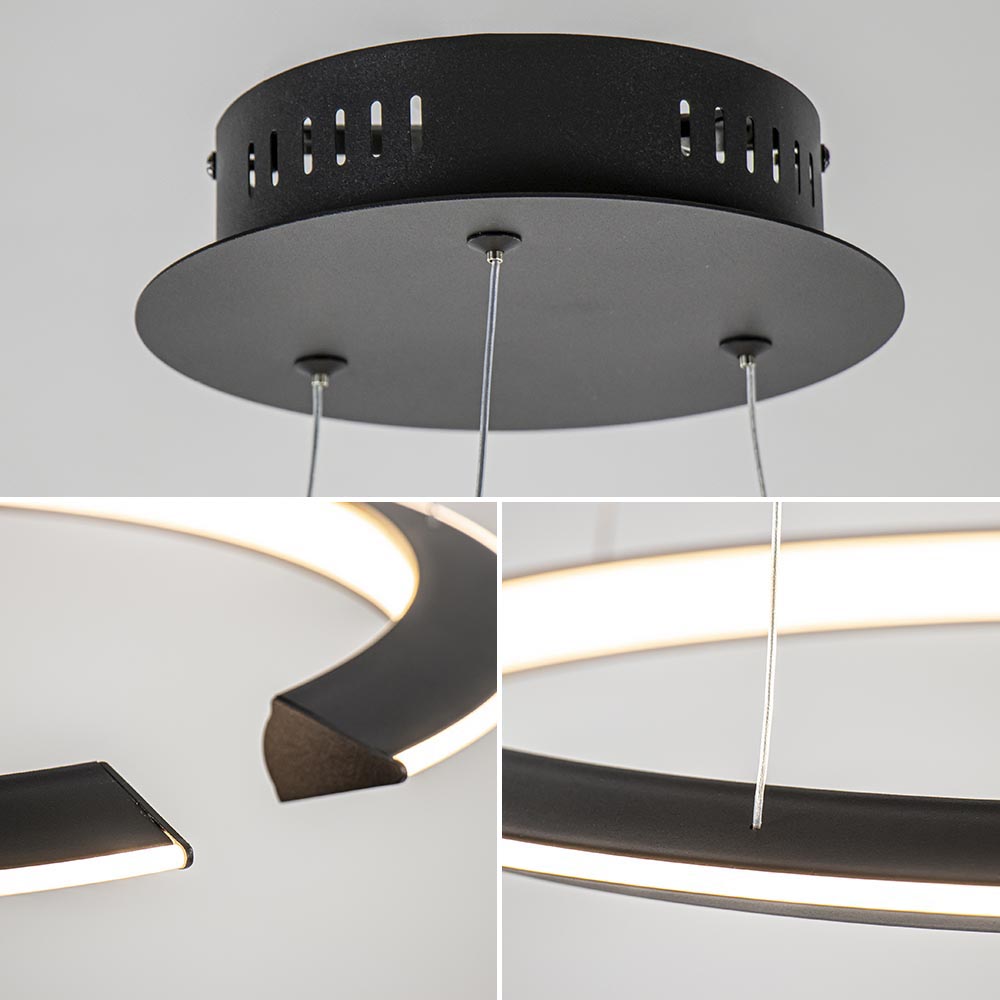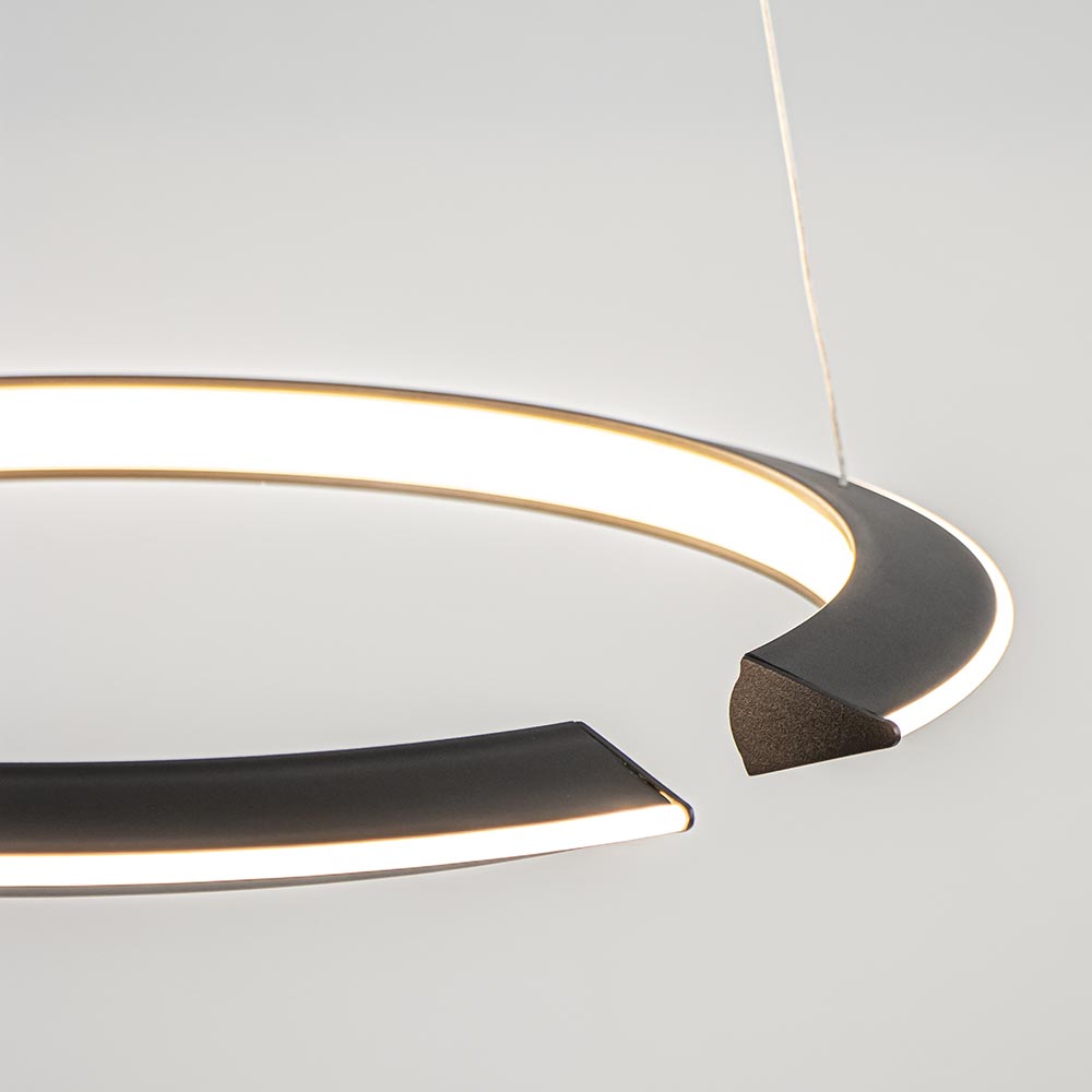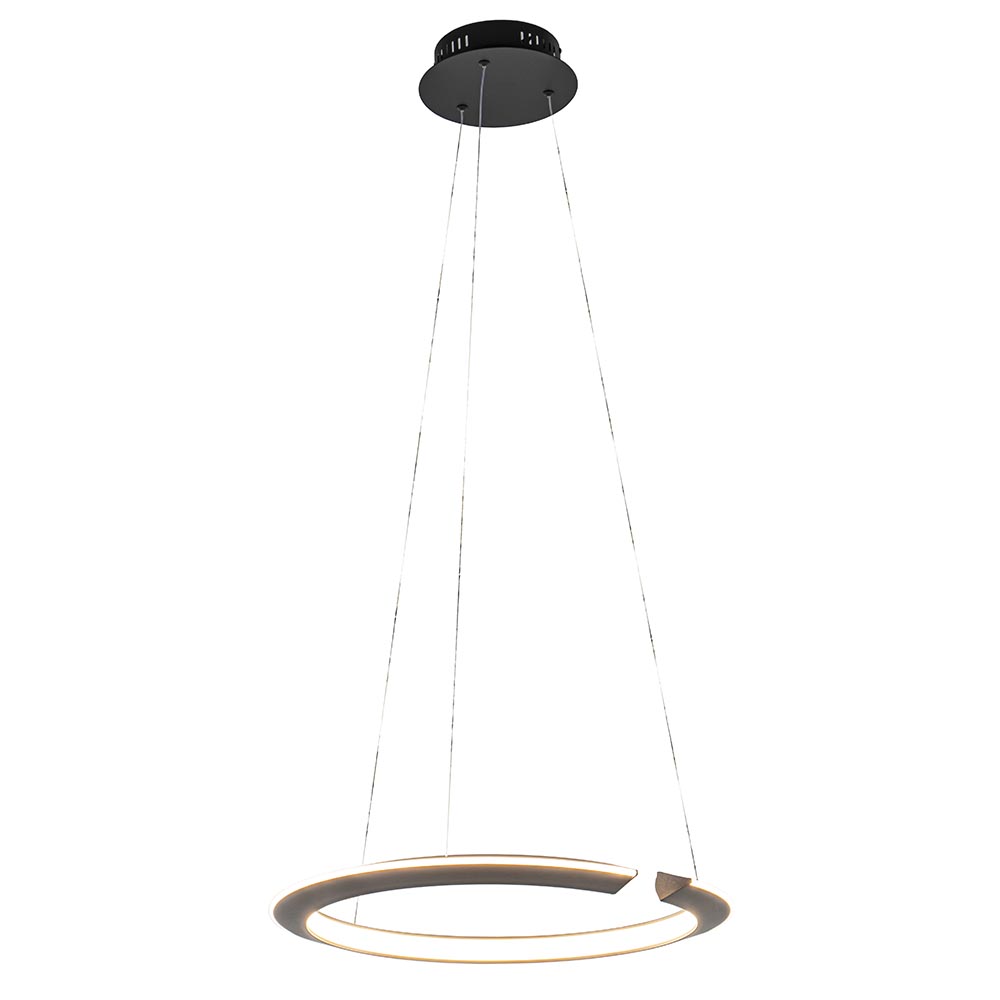 Een mooie strak vormgegeven hanglamp die prima geschikt is voor boven de eettafel of in een kantoor. De zwarte hanglamp is voorzien van LED zowel aan de binnen- als de buitenzijde van de ring. Dit zorgt voor een fijne lichtverspreiding en met 2700 Kelvin geeft de lamp een sfeervolle verlichting, ideaal om bij te dineren of te werken. De zwarte ring hangt aan drie smalle staalkabeltjes die naar wens zijn in te korten en de design hanglamp wordt aan het plafond bevestigd met een ronde zwarte plaat. De LED design hanglamp is dimbaar dmv een externe dimmer (exclusief).