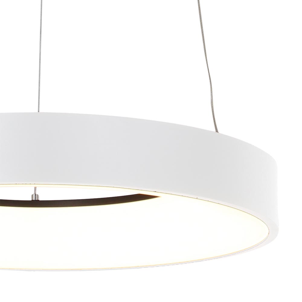 Deze moderne hanglamp is een ideale toevoeging aan het interieur. De witte hanglamp is prima geschikt voor een eetkamer, slaapkamer of kantoor. De ronde hanglamp bestaat uit een metalen ring die is voorzien van een LED strip aan de binnenzijde van de kap. Het LED geeft met 2700 Kelvin een sfeervolle warm witte verlichting en zorgt met 3600 lumen voor genoeg lichtopbrengst. Dit is eventueel te dimmen d.m.v de juiste LED dimmer (exclusief). De LED ring hangt aan 3 smalle staaldraden die naar wens zijn in te korten en de moderne hanglamp wordt aan het plafond bevestigd met een ronde witte bevestiging.