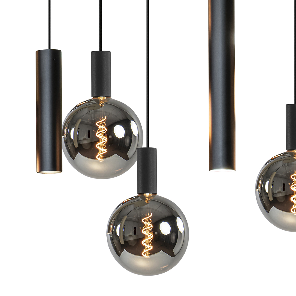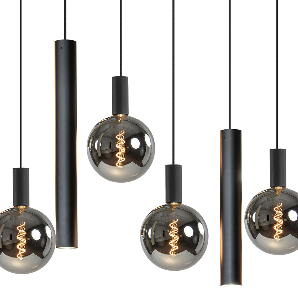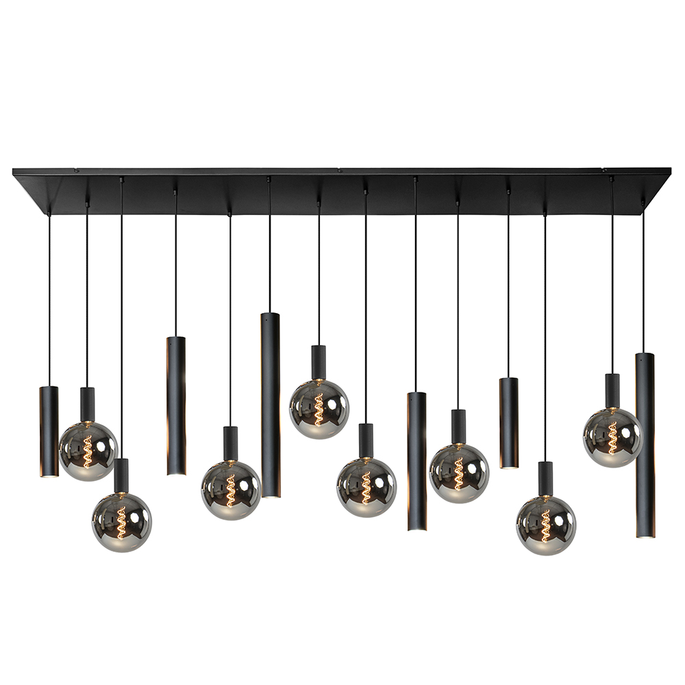 Deze prachtige design hanglamp is een ware eyecatcher in de eetkamer. De grote 14-lichts hanglamp brengt sfeer en functie met zich mee. De diverse cilinders zorgen ervoor dat de tafel onder de lamp goed wordt uitgelicht, terwijl de decoratieve lichtbronnen zorgen voor sfeervol diffuus licht in de ruimte. De hanglamp is gemaakt van metaal en uitgevoerd in het zwart. Door het verschil in hoogte in de kappen krijgt de lamp een mooie speelse verdeling die u helemaal eigen kunt maken. De 14-lichts hanglamp is dimbaar middels een externe dimmer (exclusief).