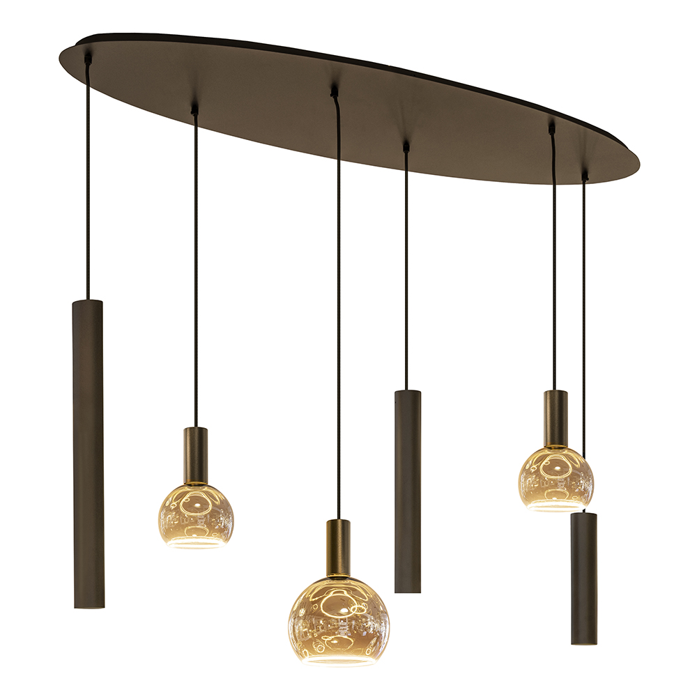Deze prachtige hanglamp past perfect in een design of luxury interieur. De hanglamp is uitgevoerd in het platinum en voorzien van een grote ovale plaat van 120 cm lang. Ideaal voor boven een ovale eettafel. De hanglamp heeft 6 lichtpunten waarvan er 3 een pendel met E27 fitting hebben en 3 een cilinder met een GU10 fitting. De cilinders hebben diverse afmetingen en zorgen dat er goed licht wordt verspreid op de ondergrond. De E27 pendels zorgen daarbij voor extra diffuus licht en sfeer. De ovale hanglamp is naar wens in hoogte te verdelen met een maximale hoogte van 130 cm.