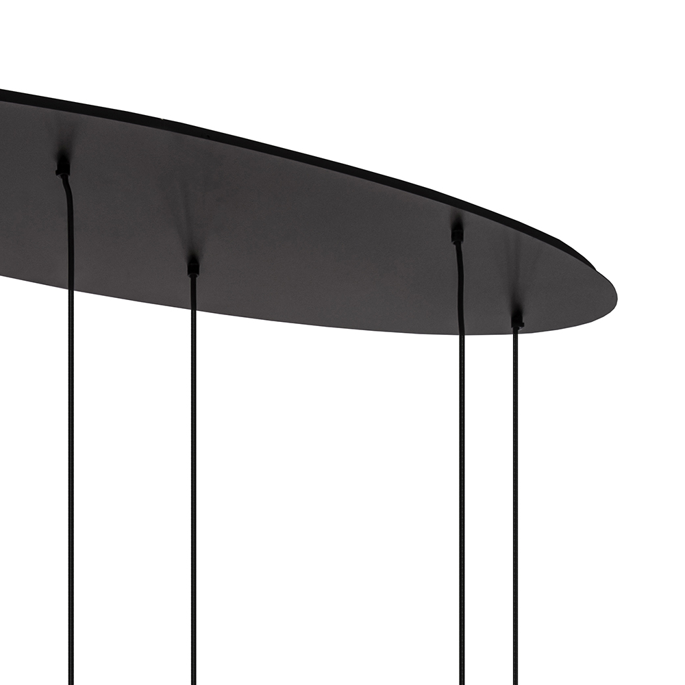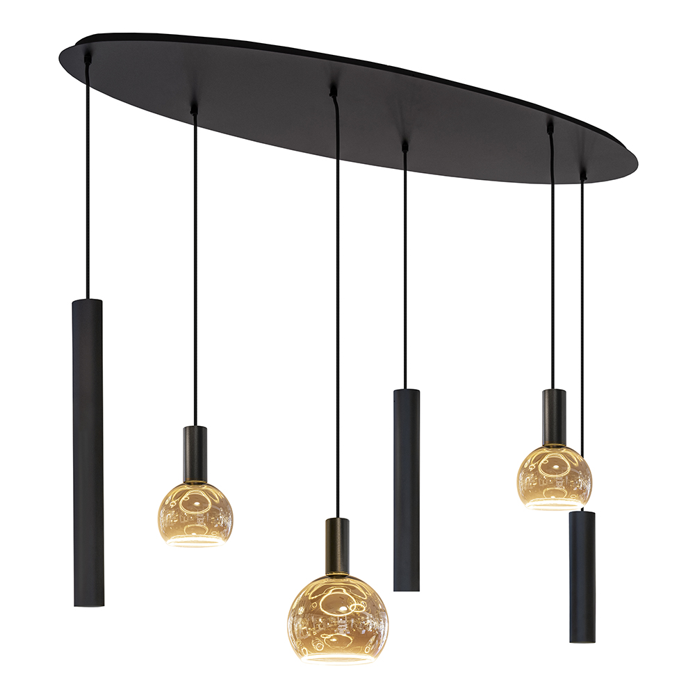 Deze prachtige hanglamp past perfect in een design of luxury interieur. De hanglamp is uitgevoerd in het zwart en voorzien van een grote ovale plaat van 120 cm lang. Ideaal voor boven een ovale eettafel. De hanglamp heeft 6 lichtpunten waarvan er 3 een pendel met E27 fitting hebben en 3 een cilinder met een GU10 fitting. De cilinders hebben diverse afmetingen en zorgen dat er goed licht wordt verspreid op de ondergrond. De E27 pendels zorgen daarbij voor extra diffuus licht en sfeer. De ovale hanglamp is naar wens in hoogte te verdelen met een maximale hoogte van 130 cm.