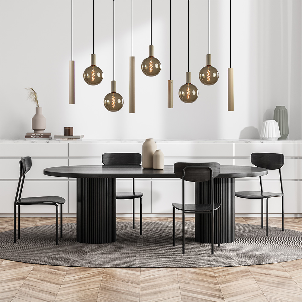 Deze prachtige hanglamp past perfect in een design of luxury interieur. De hanglamp is uitgevoerd in het quartz en voorzien van een grote rechthoekige plaat van 170 cm lang. Ideaal voor boven een eettafel. De hanglamp heeft 9 lichtpunten waarvan er 5 een pendel met E27 fitting hebben en 4 een cilinder met een GU10 fitting. De cilinders hebben diverse afmetingen en zorgen dat er goed licht wordt verspreid op de ondergrond. De E27 pendels zorgen daarbij voor extra diffuus licht en sfeer. De hanglamp is naar wens in hoogte te verstellen met een maximale hoogte van 130 cm. De designlamp wordt geleverd exclusief lichtbronnen!