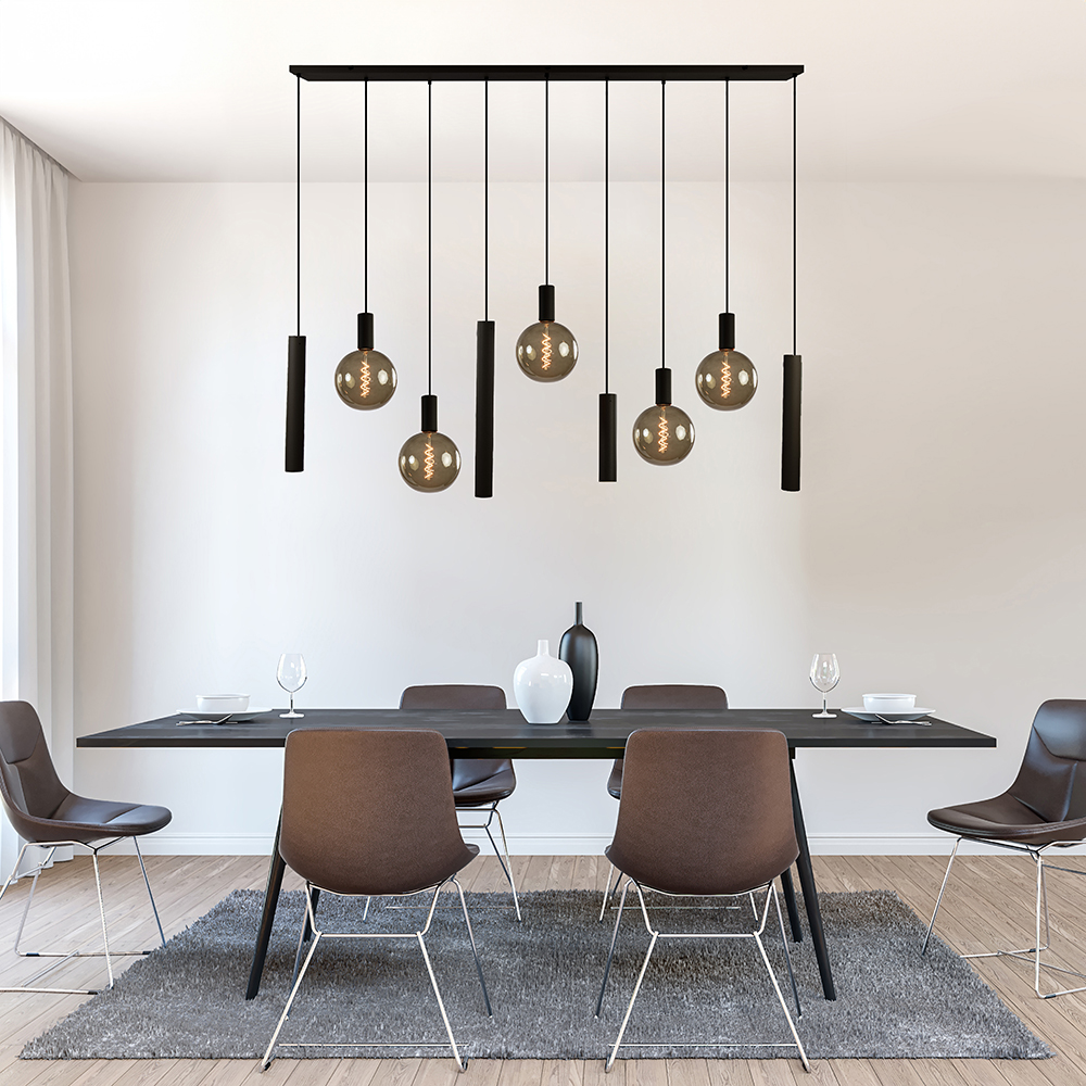 Deze prachtige hanglamp past perfect in een design of luxury interieur. De hanglamp is uitgevoerd in het zwart en voorzien van een grote rechthoekige plaat van 170 cm lang. Ideaal voor boven een eettafel. De hanglamp heeft 9 lichtpunten waarvan er 5 een pendel met E27 fitting hebben en 4 een cilinder met een GU10 fitting. De cilinders hebben diverse afmetingen en zorgen dat er goed licht wordt verspreid op de ondergrond. De E27 pendels zorgen daarbij voor extra diffuus licht en sfeer. De hanglamp is naar wens in hoogte te verstellen met een maximale hoogte van 130 cm. De designlamp wordt geleverd exclusief lichtbronnen!
