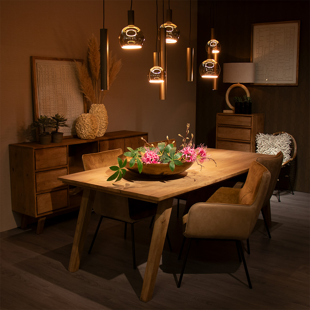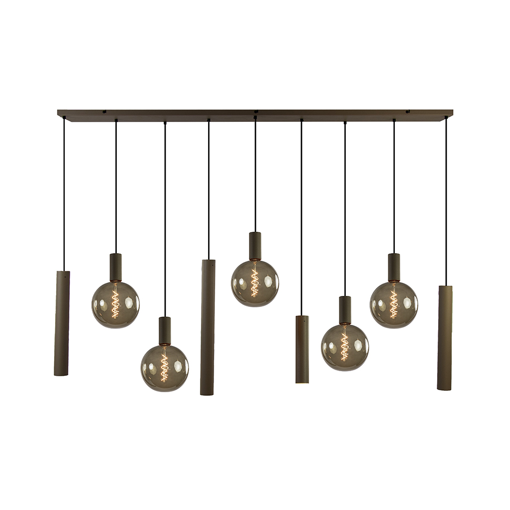Deze prachtige hanglamp past perfect in een design of luxury interieur. De hanglamp is uitgevoerd in het platinum en voorzien van een grote rechthoekige plaat van 170 cm lang. Ideaal voor boven een eettafel. De hanglamp heeft 9 lichtpunten waarvan er 5 een pendel met E27 fitting hebben en 4 een cilinder met een GU10 fitting. De cilinders hebben diverse afmetingen en zorgen dat er goed licht wordt verspreid op de ondergrond. De E27 pendels zorgen daarbij voor extra diffuus licht en sfeer. De hanglamp is naar wens in hoogte te verstellen met een maximale hoogte van 130 cm. De designlamp wordt geleverd exclusief lichtbronnen!
