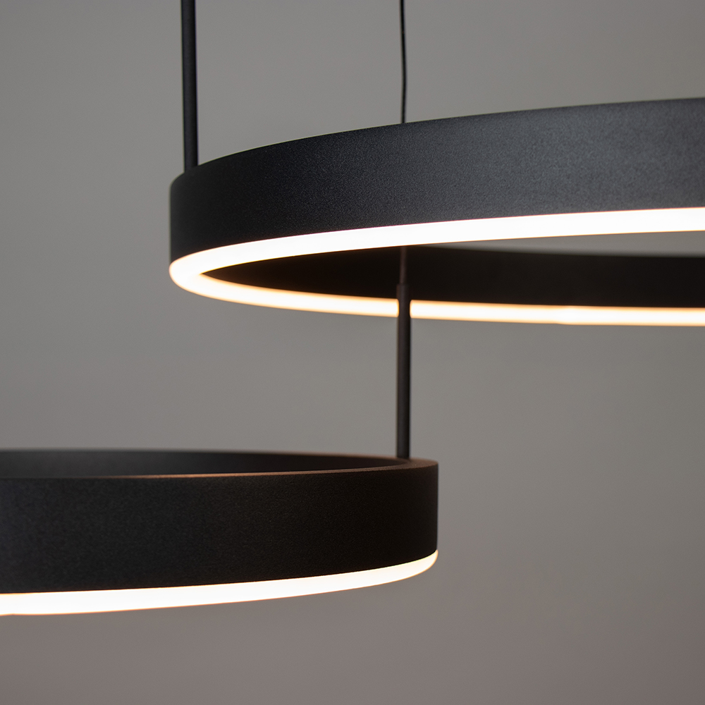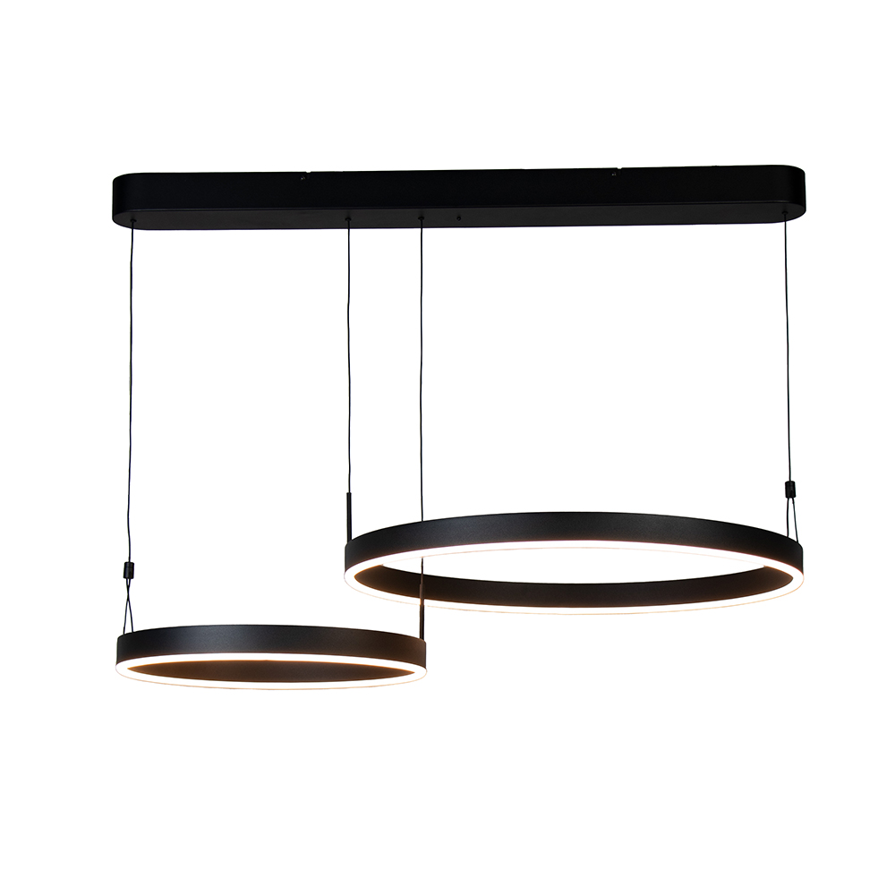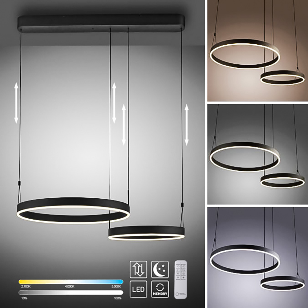Deze zwarte LED-hanglamp scoort met haar veelzijdige instelmogelijkheden. De mooie ringlamp is uitgerust met een LED kleurtemperatuurregeling. Met de meegeleverde infrarood afstandsbediening is de lichtkleur en hardheid met één druk op de knop aan te passen aan jouw persoonlijke wensen en eisen. Of het nu gaat om ontspannen licht voor gezellige avonden of helder, productief licht voor geconcentreerd werken. Dankzij de geheugenfunctie blijven de geselecteerde instellingen bewaard totdat je een wijziging doorvoert. Hierdoor zijn uw persoonlijke instellingen direct weer opvraagbaar. De twee lichtringen zijn individueel in hoogte verstelbaar, door middel van het Comfort Lift systeem. Dit is niet alleen snel en eenvoudig, maar ook uiterst betrouwbaar. Dankzij het ingebouwde mechanisme in de luifel zijn vervelende contragewichten geen probleem meer.