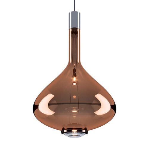 Een luxe hanglamp van Italiaans design. De bronzen glazen hanglamp Sky-Fall is vervaardigd uit het beste glas en voorzien van de nieuwste LED technologie. De vorm van het glas is geïnspireerd op oude karraffen en is mondgeblazen in Italië. De LED technologie in het glas zorgt ervoor dat de lamp zowel direct als indirect licht geeft en met 2700 Kelvin mooi warm wit licht. Met 1815 lumen geeft de lamp een fijne lichtopbrengst die middels een externe dimmer ook is te dimmen (exclusief). De lamp kan als losse pendel worden opgehangen, maar is ook te bundelen met meerdere op een balk of met diverse soorten bij elkaar. De Italiaanse design hanglamp glas is afgewerkt met chromen details en is mooi te combineren in diverse woonstijlen.