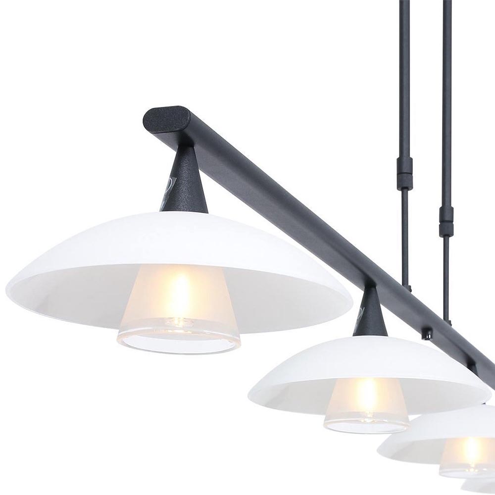 – hoogte: 75-120 cm – schotels: Ø18×6,5 cm – bevestiging: Ø21×3 cm – lengte: 110 cm – metaal, zwart – wit glas – inclusief LED – 2700 Kelvin – 300 lumen – dimbaar – inclusief dimmer