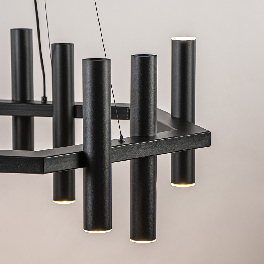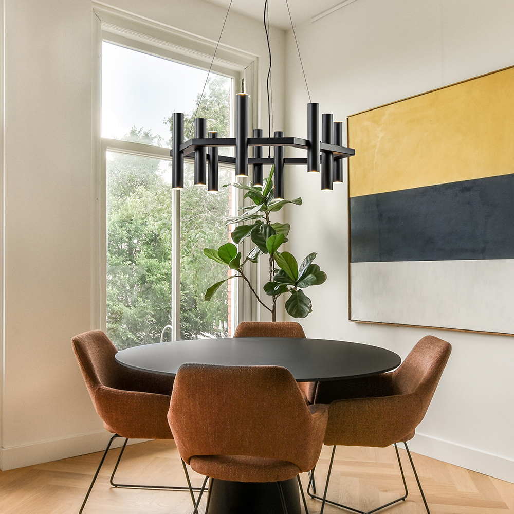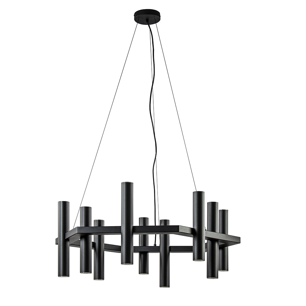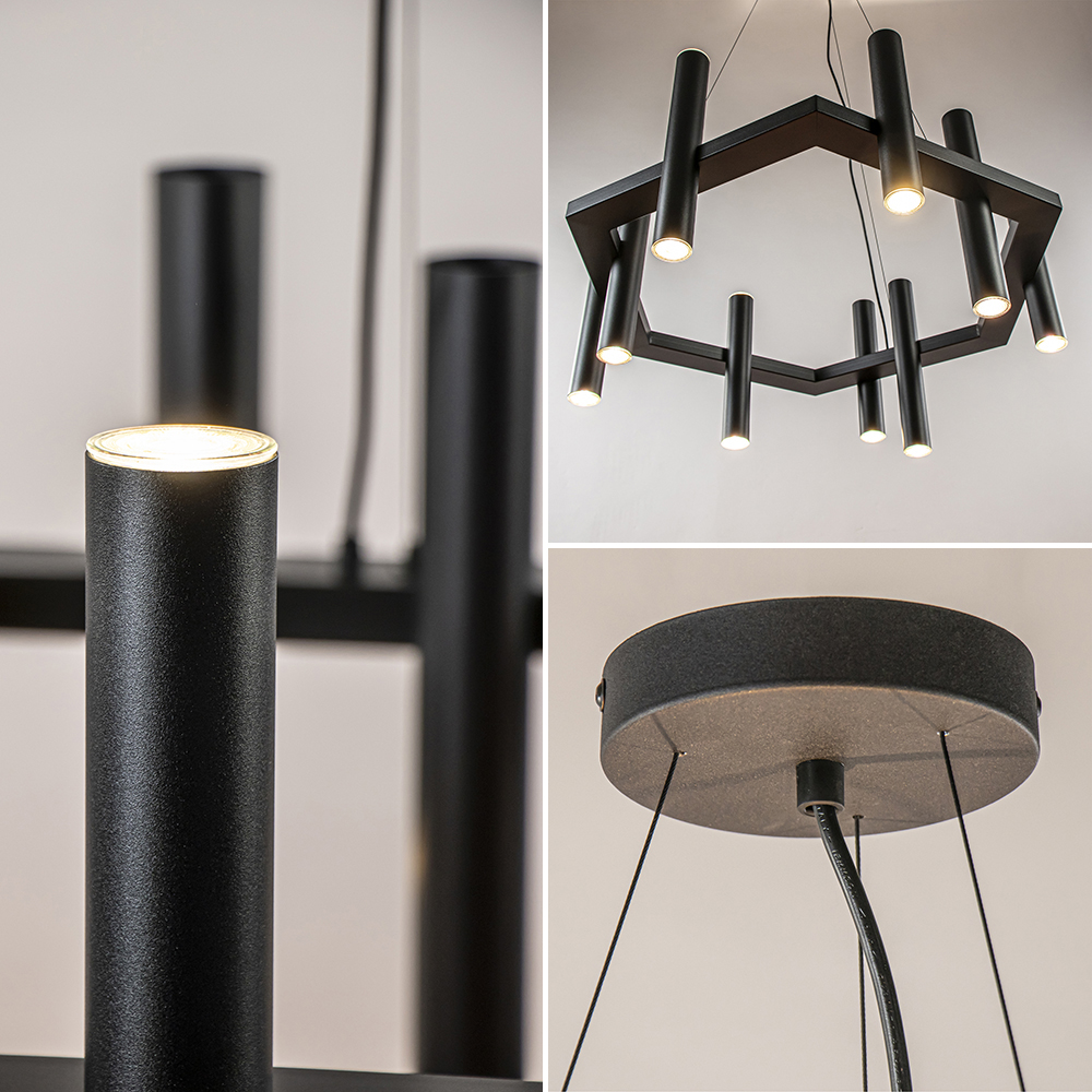 Deze stijlvolle hanglamp is een mooie toevoeging aan de eetkamer, hal of zelfs vide. De hanglamp is gemaakt van metaal en uitgevoerd in het mat zwart. De 12 lichtpunten zitten verdeeld over de 9 cilinders die zijn bevestigd op een 6-hoekig armatuur. 3 cilinders zijn ook aan de bovenzijde voorzien van een lichtpunt. Zo werkt de design hanglamp zowel als een up en downlighter. De hexagon hanglamp met cilinders heeft een hoogte van 130 cm en is naar wens in te korten. De designlamp is dimbaar middels een externe dimmer (exclusief) en wordt gelverd exclusief lichtbronnen.