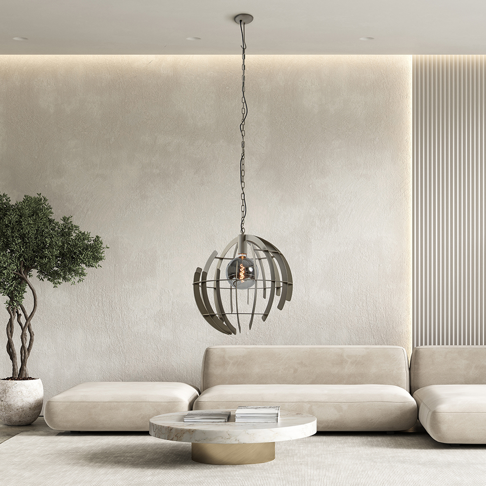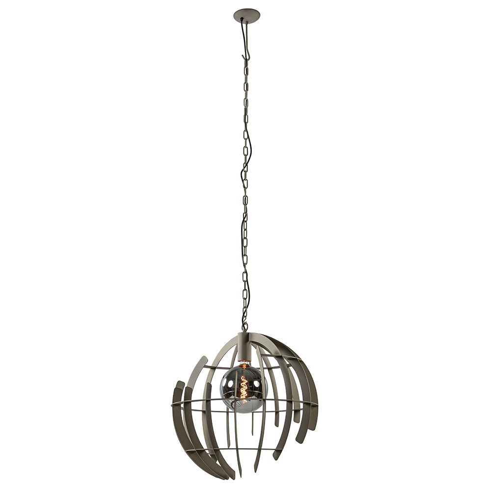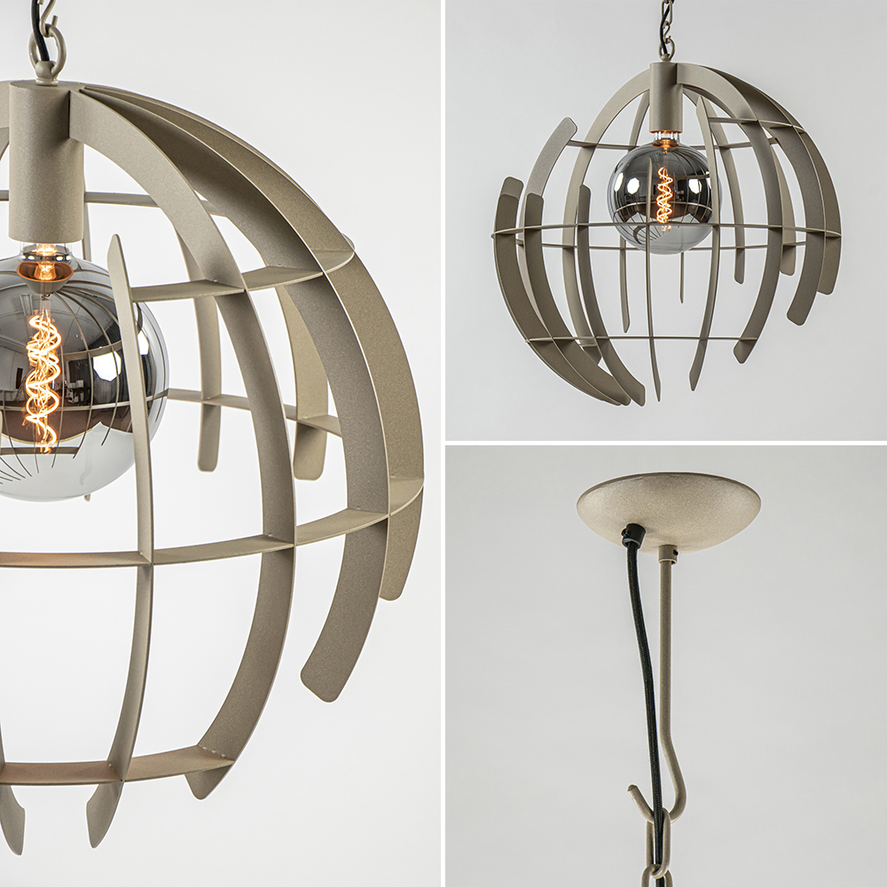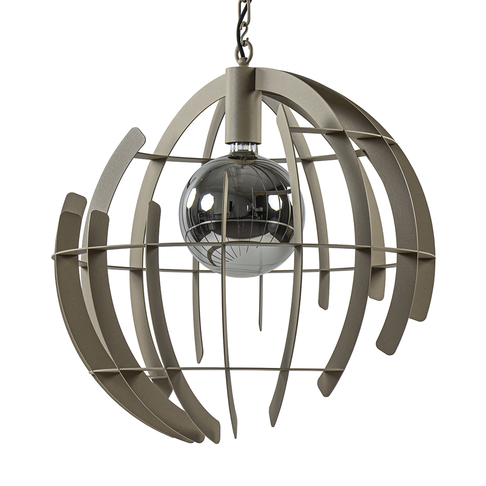 Stoer van design en strak in lijnenspel. Deze ronde hanglamp is voledig gemaakt van metaal en uitgevoerd in de kleur quartz (beige). De grote bol is samengesteld uit metalen ribben in diverse afmetingen. Dit geeft de bol een speelse look met een a-symetrisch effect. Van elke zijde ziet deze hanglamp er dus anders uit! Door z’n grootte past de lamp mooi boven een ronde eettafel of in een ruimte met een hoog plafond. De ronde hanglamp is dimbaar middels een externe dimmer (exclusief).