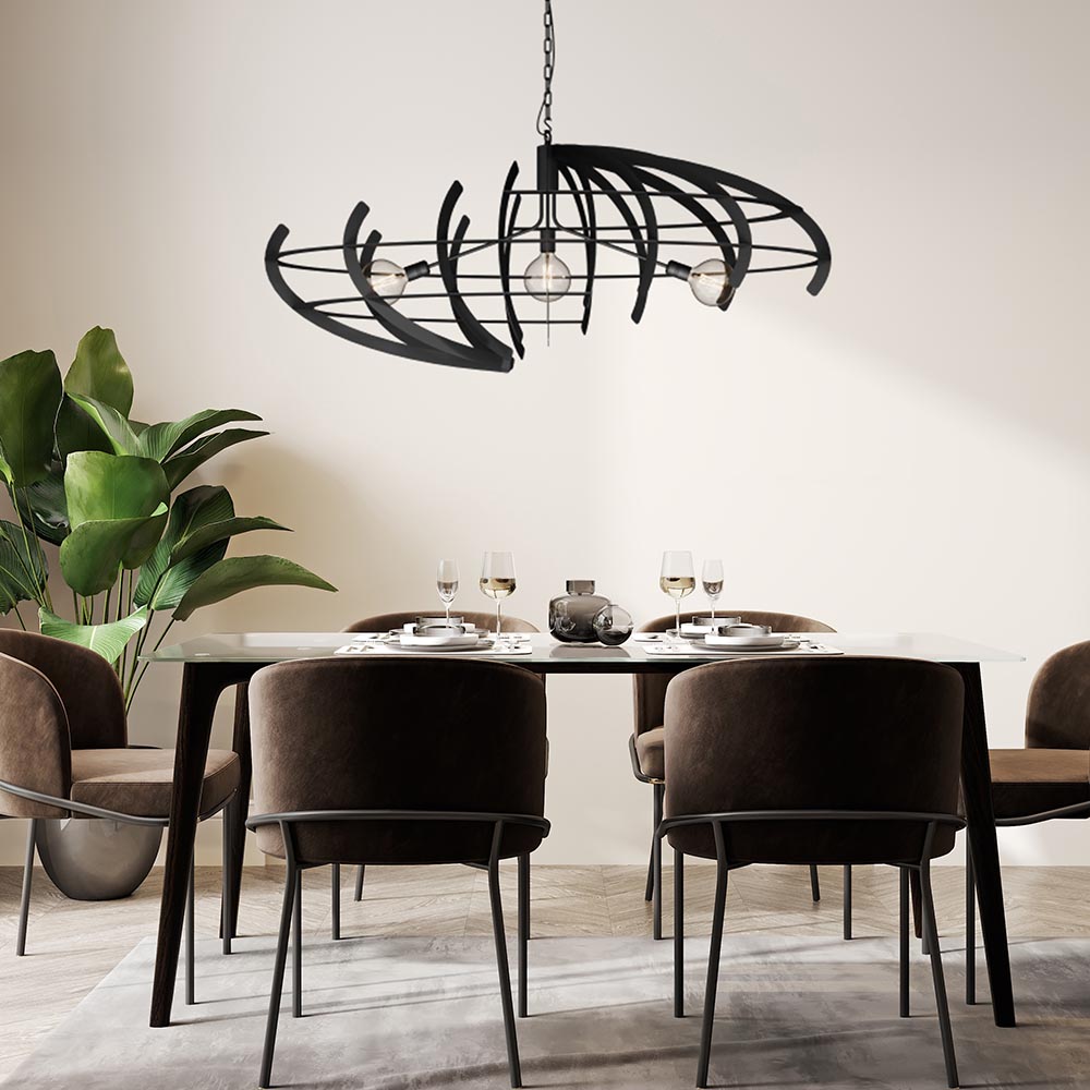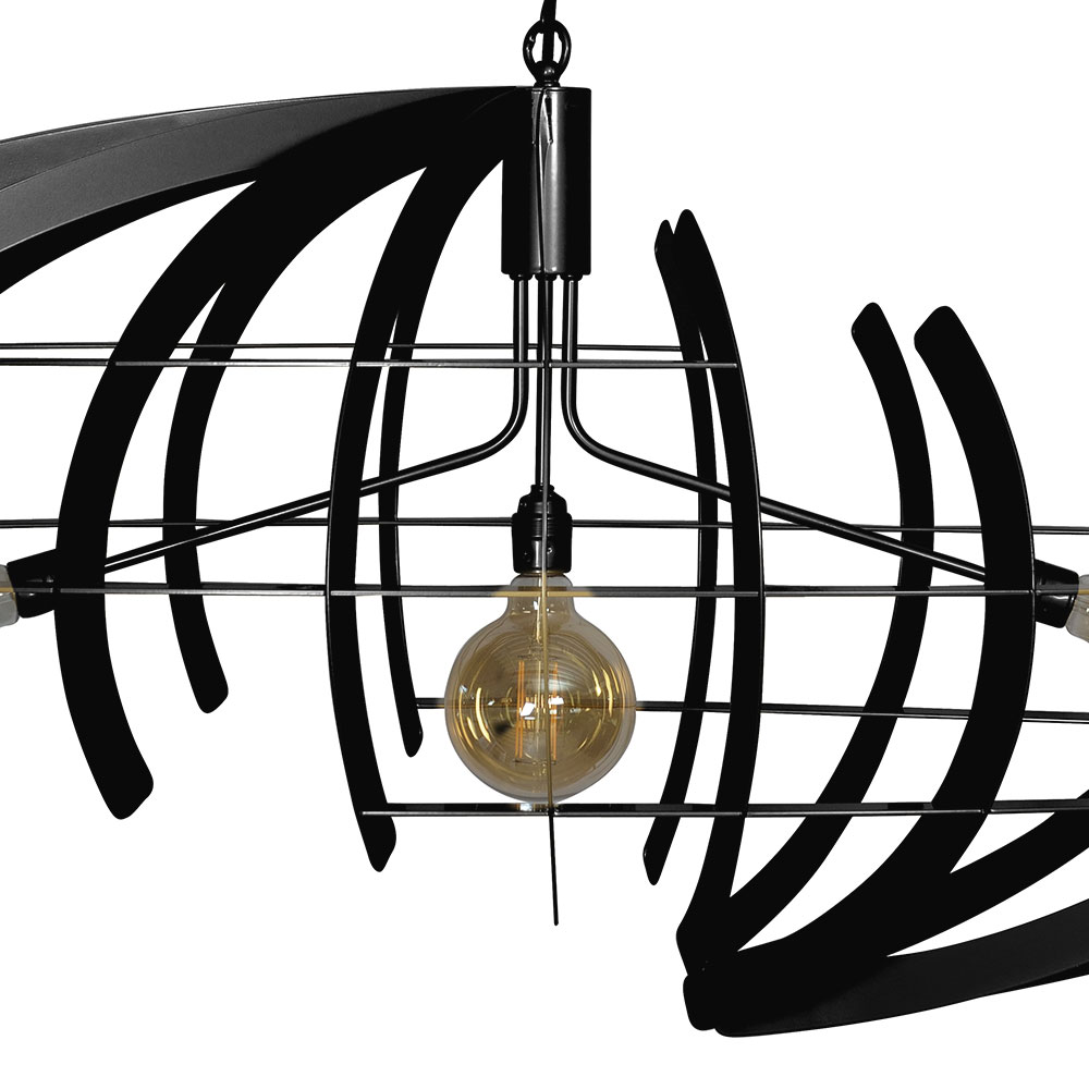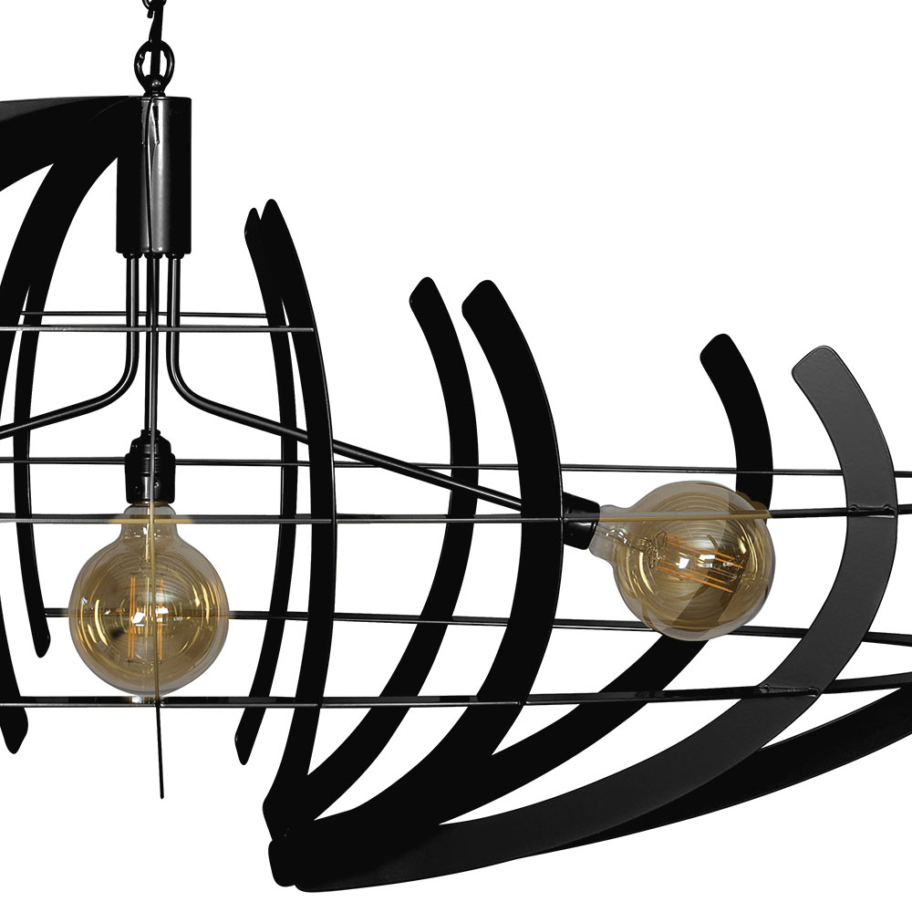 Een prachtige exemplaar is deze grote hanglamp. De hanglamp is ovaal en staat daarmee prachtig boven een grote ovalen eettafel. De lamp is opgebouwd uit platte ribben. Aan twee zijdes is een cirkelvormige uitsnede gemaakt. Dit zorgt voor zowel een speels effect als balans in de lamp, een spannende combinatie! De hanglamp is gemaakt van metaal en afgewerkt met een zwarte poedercoating. De ovale eettafellamp hangt aan een stevige ketting en is naar wens in te korten.