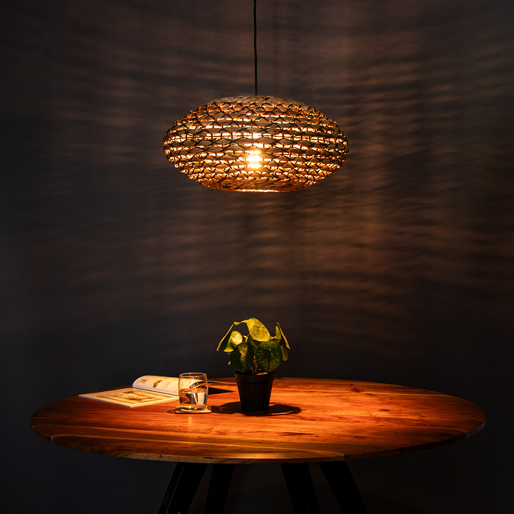 Details: – Afmetingen: ø50 x 155 cm – Kap: ø50 x 23,5 cm – bevestiging: ø12 x 2,6 cm – Snoer lengte: 155 cm – Schakelaar: 42 cm – Materiaal: Rattan & metaal – Kleur: Naturel & wit – Gewicht: 1,9 kg – In hoogte verstelbaar – Fitting: E27 (excl.)