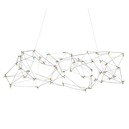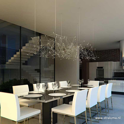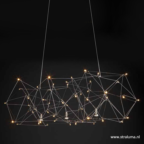 Met deze luxe design hanglamp maakt u een mooi statement een huis. De kap heeft een lengte van maar liefst 125 cm waardoor deze mooi past boven een grote lange tafel. De moderne hanglamp heeft een open structuur zodat deze luchtig oogt in de ruimte. De kap is gemaakt van een stalen frame waarin op ieder punt een LED lampje is verwerkt. Deze zorgen voor een fijne en sfeervolle verlichting. Daarnaast zijn er ook drie LED spots onderin de kap verwerkt die zorgen dat de tafel onder de lamp mooi wordt verlicht. De kap geeft dus zowel accent als sfeerverlichting, ideaal voor het dineren en natafelen. De stalen kap hangt aan twee draden en wordt met een ronde bevestiging aan het plafond opgehangen. Een mooie sfeervolle design lamp voor een moderne, luxe woonstijl.