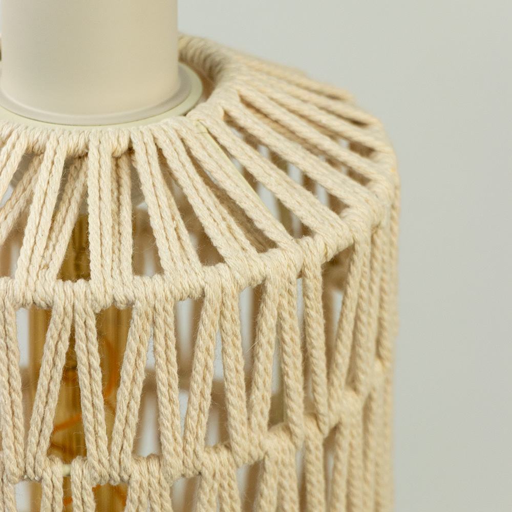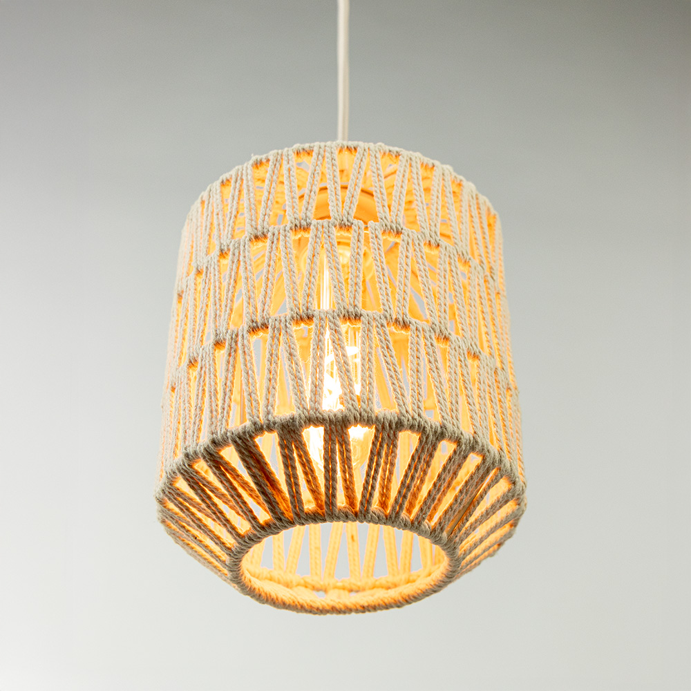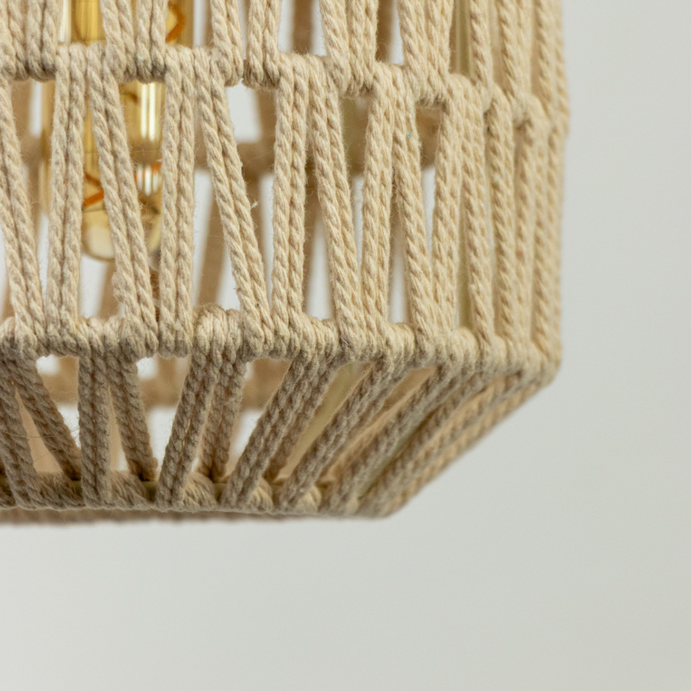 Deze compacte hanglamp met cilindervormige kap is een subtiele blikvanger die perfect past in bohemian, Scandinavische en Japandi interieurs. Het open gevlochten ontwerp van stof en metaal zorgt voor een speels lichteffect en brengt warmte in elke ruimte. Ideaal voor gebruik boven een eettafel, in de hal of als onderdeel van een speels cluster.
