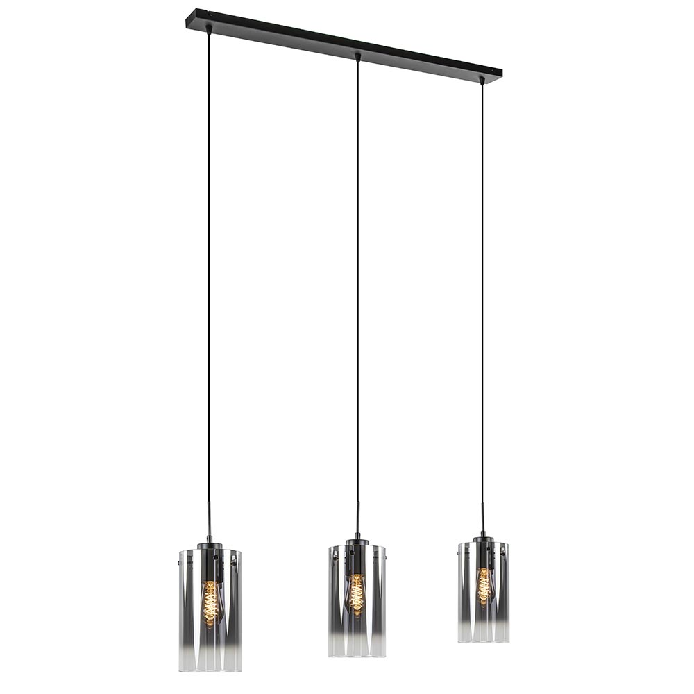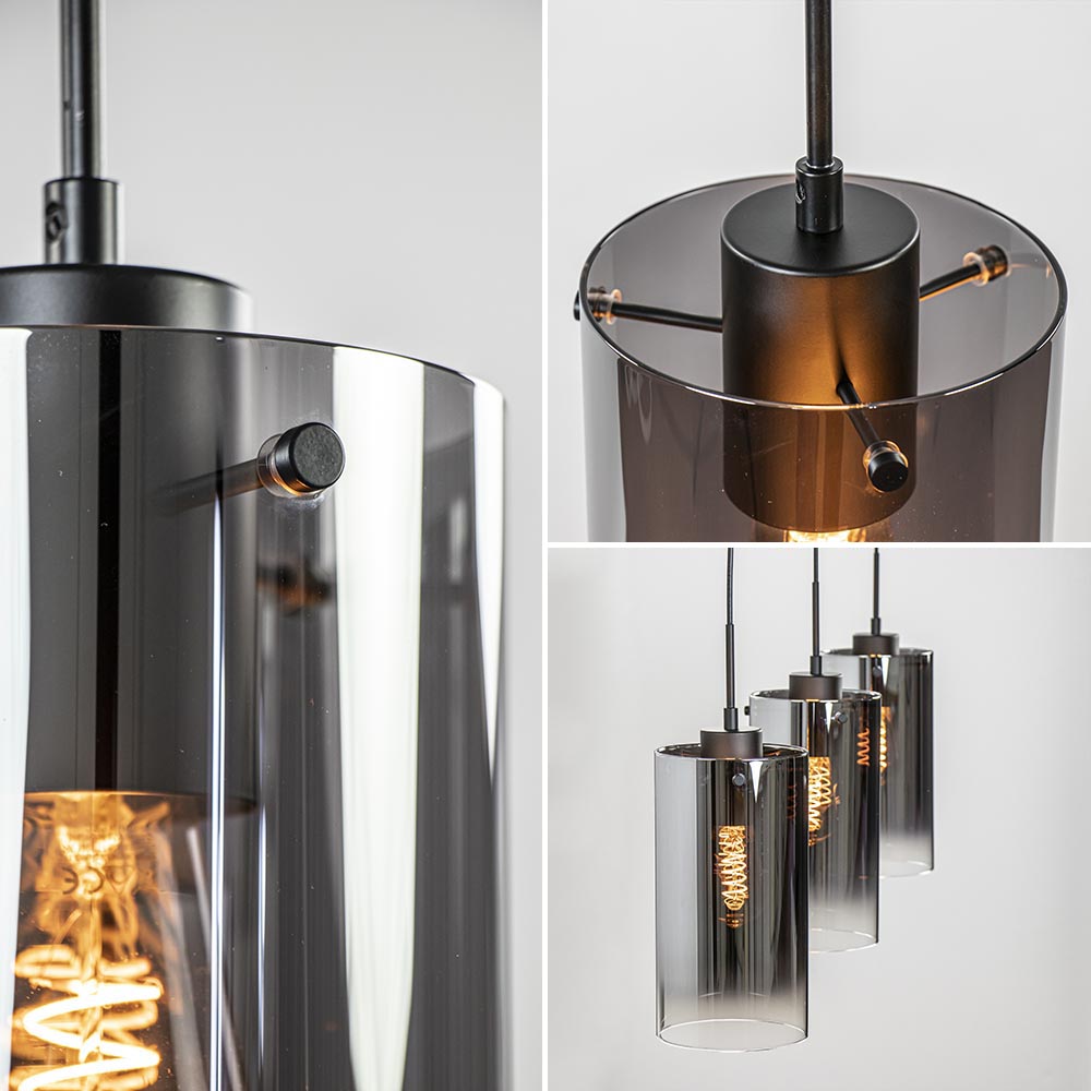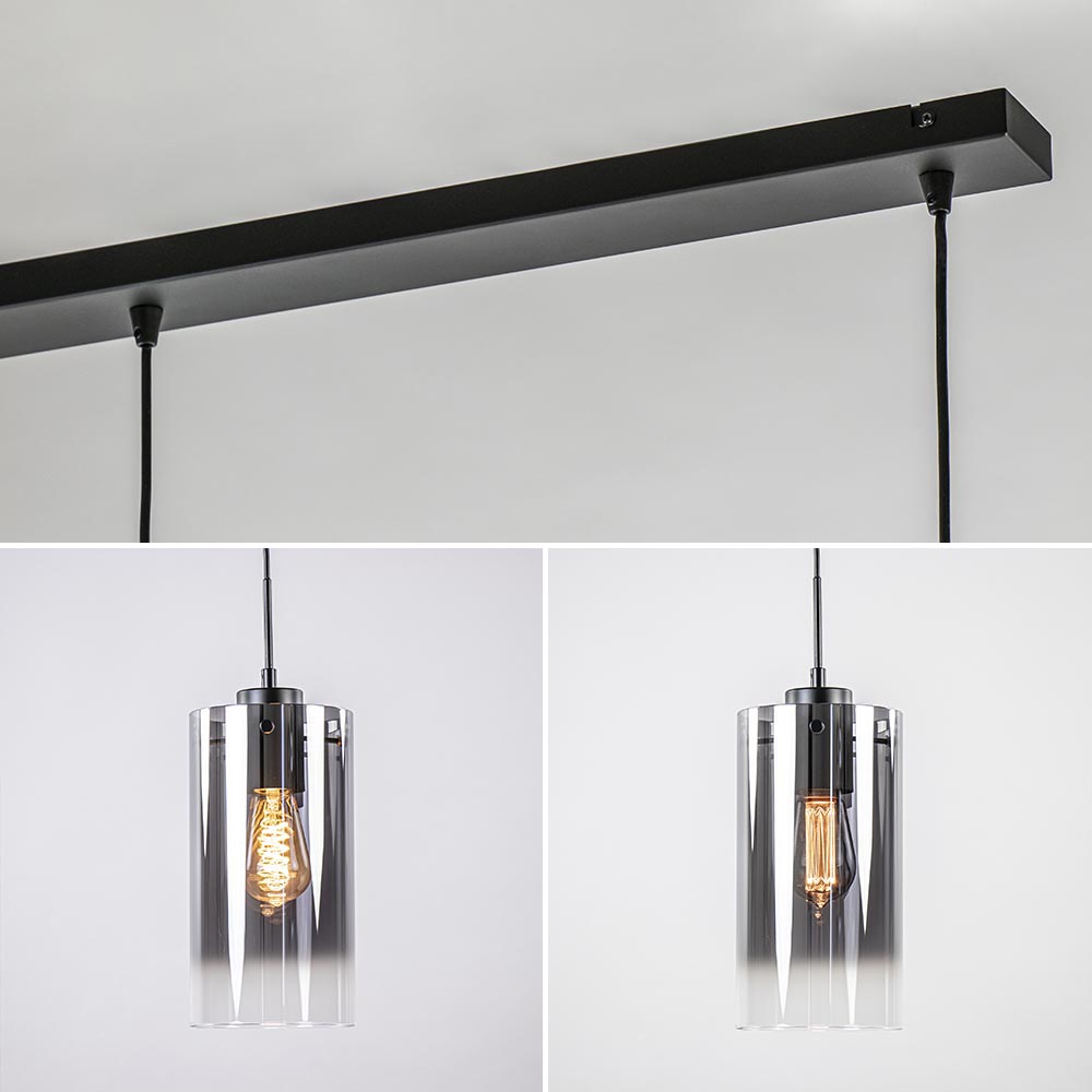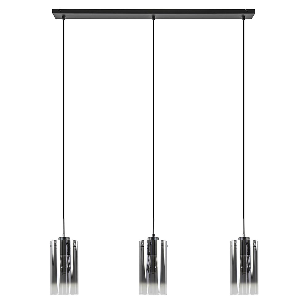 Een moderne hanglamp met een luxe uitstraling. Deze 3-lichts hanglamp heeft 3 cilindervormige glazen kappen. Het mooie verloop van licht naar donker in het glas zorgt voor een luxe en chique uitstraling. De glazen worden bevestigd aan de fitting met 3 schroefjes. De moderne hanglamp wordt aan het plafond bevestigd met een mat zwarte metalen balk en hangt mooi boven een rechthoekige eettafel. Mocht de hanglamp te lang zijn, dan zijn de snoeren gemakkelijk in te korten.