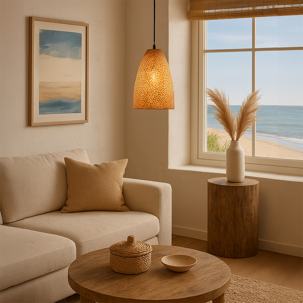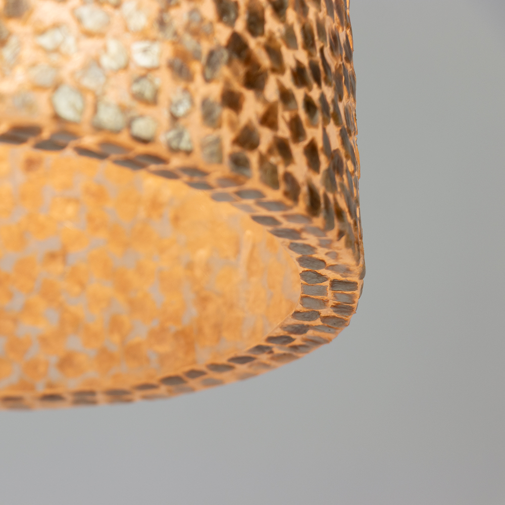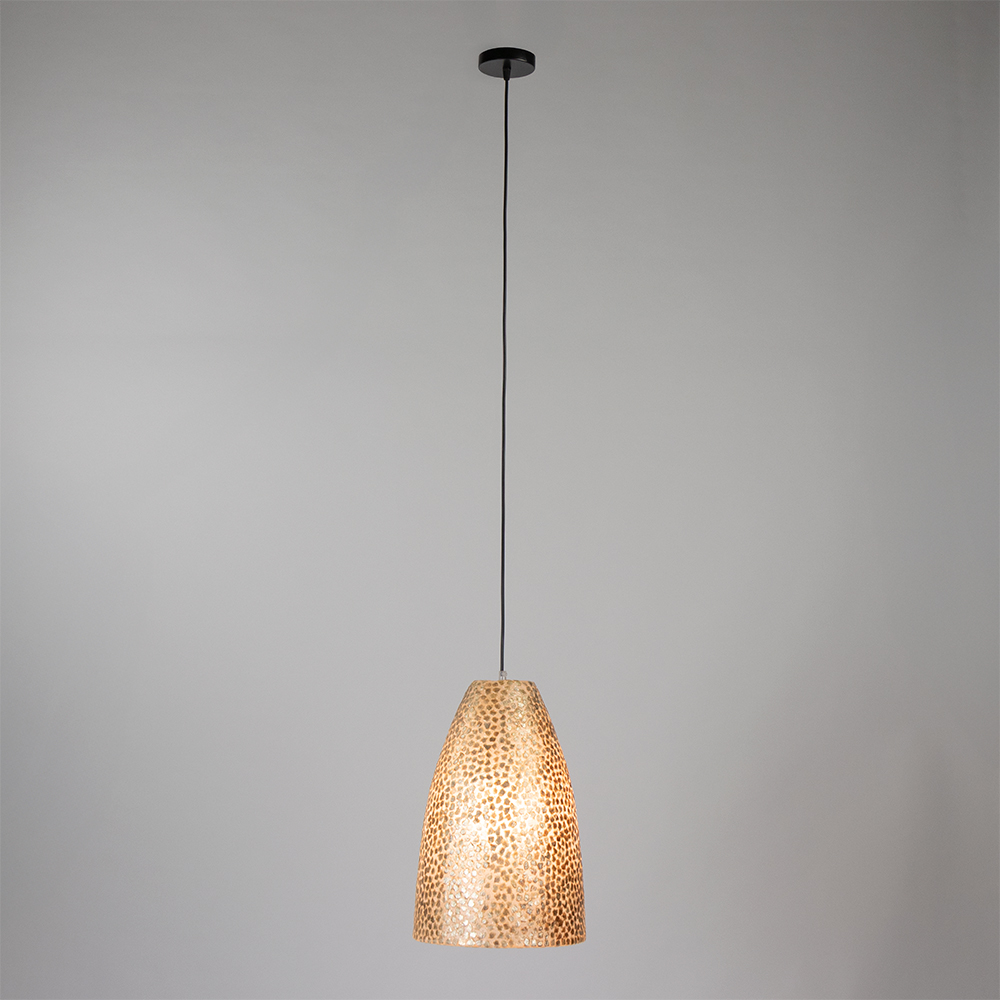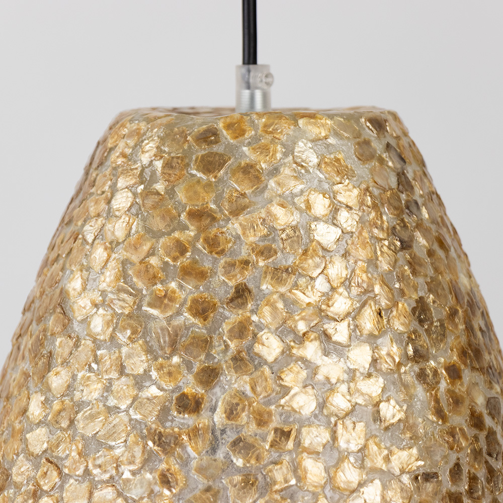 Deze sfeervolle schelpen hanglamp zorgt dat je je waant in een strandhuis. De lamp is gemaakt van gebroken stukjes capiz schelpen en geeft direct het strand gevoel in huis. Dit wordt extra versterkt wanneer de hanglamp wordt aangezet en de schelpen oplichten en een warme en gezellige sfeer geven. De schelpen kap hangt aan een transparant snoer met stalen plafondbevestiging en is gemakkelijk in hoogte te verstellen.