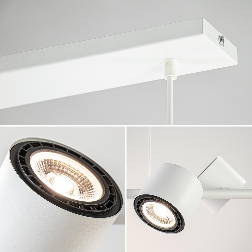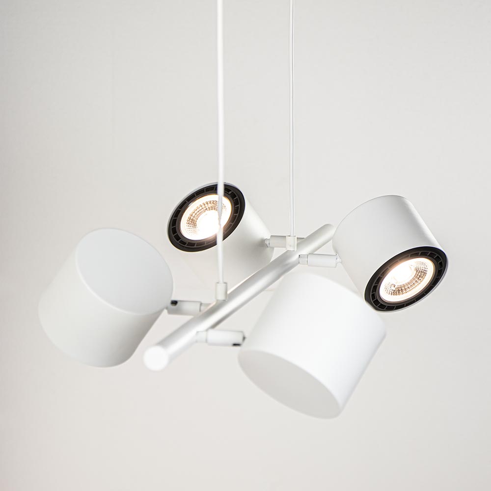 Bent u op zoek naar een hanglamp die veel lichtopbrengst heeft? Dan bent u hier aan het juiste adres. Deze moderne 4-lichts hanglamp is voorzien van LED spots welke een lichtopbrengst geven maar liefst 820 lumen. Is dit voor de soms net even te veel, dan dimt u de spots gemakkelijk terug tot 30% via een externe dimmer (exclusief). De spots zijn verder verstelbaar door deze te draaien en/of te kantelen zodat u zelf bepaald hoe u het licht wilt verspreiden. Zo kunt alle spots naar beneden of boven richten, of juiste beide. Ideaal voor boven een kookeiland of in een kantoor. De 4 spots zijn bevestigd op een metalen armatuur welke hangt aan twee witte snoeren. De witte hanglamp is verstelbaar in hoogte met een maximale hoogte van 110 cm. De LED spots geven met een temperatuur van 3000-2200 Kelvin een warm witte verlichting en hebben een stralingshoek van 40°.