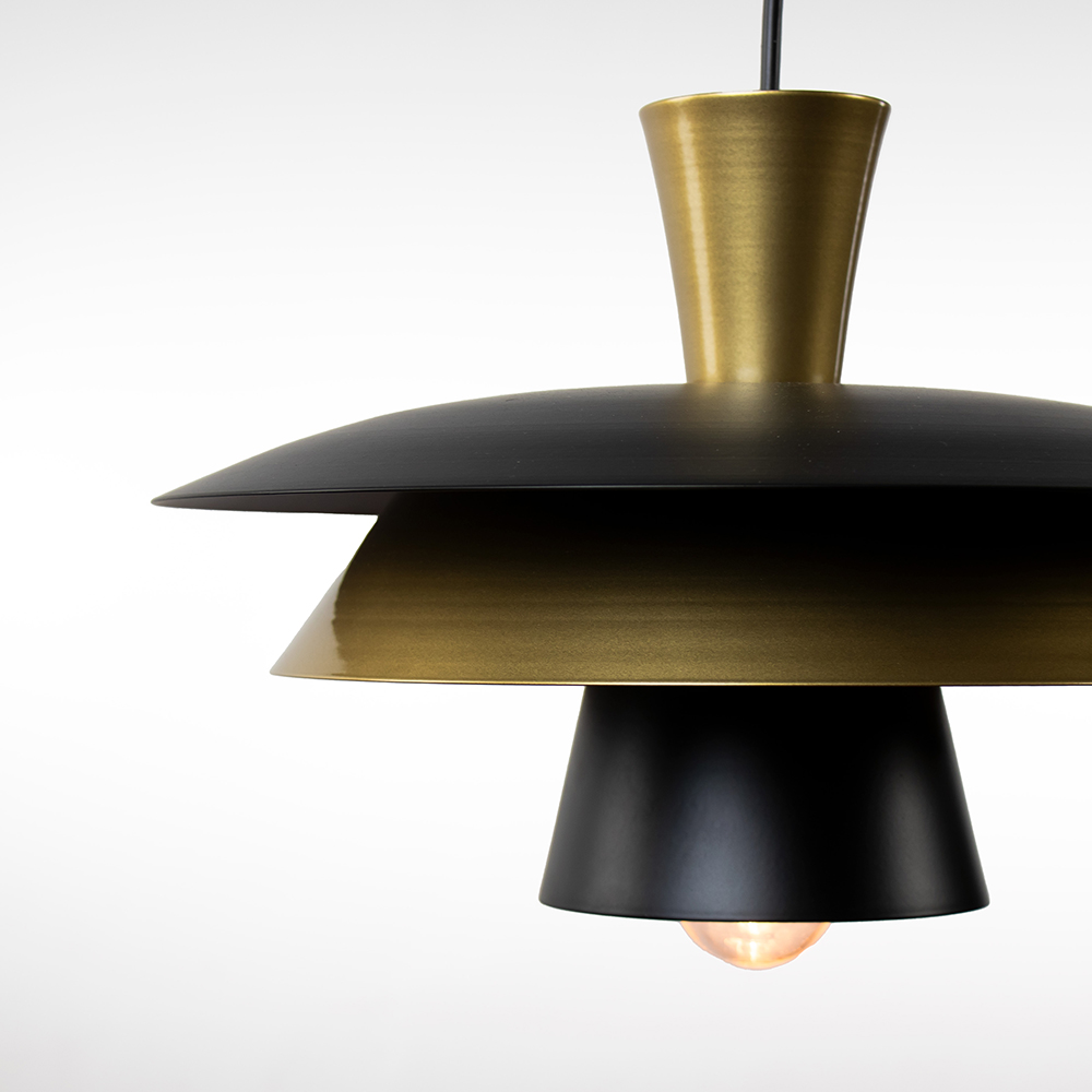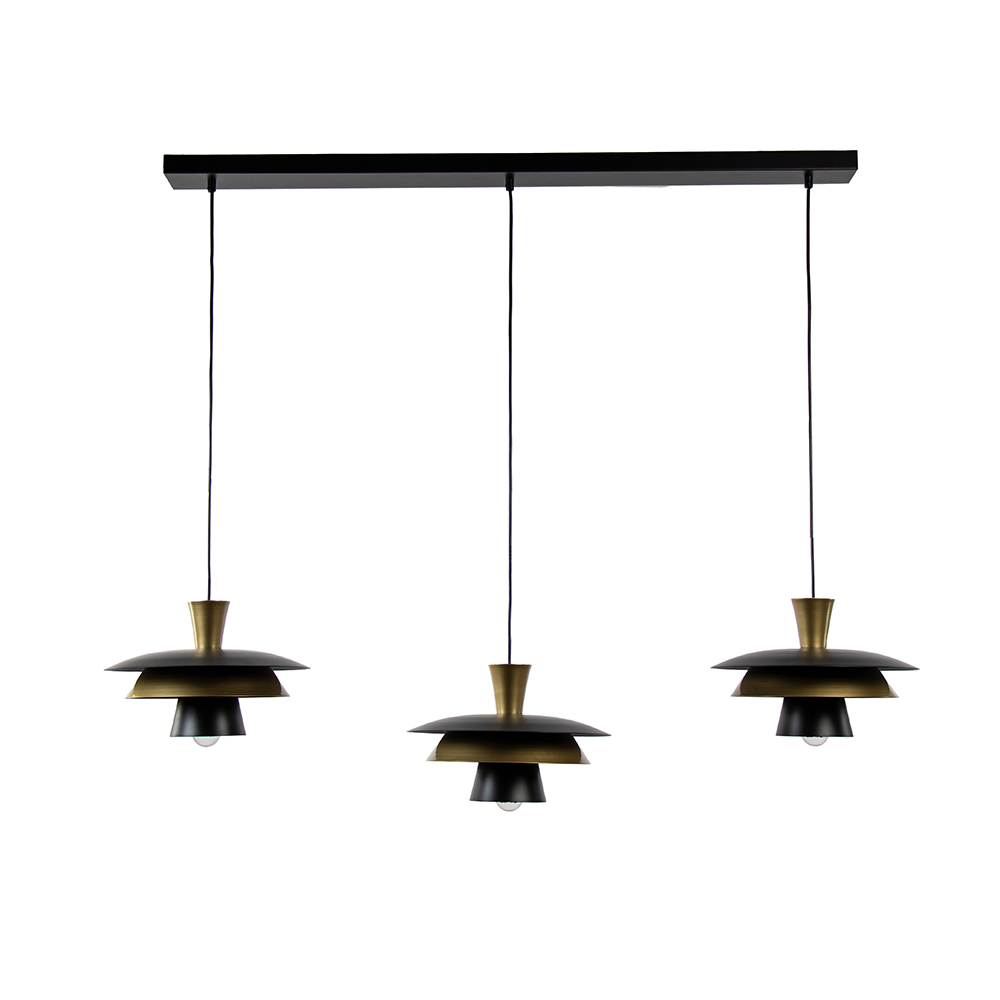 Details: – Afmetingen: 110x33x120 cm – Kap: ø33 x 21 cm – Plafondbevestiging: 8x110x3 cm – Kleur: mat zwart & goud – Materiaal: metaal – Fitting: 3x E27 (Excl.)