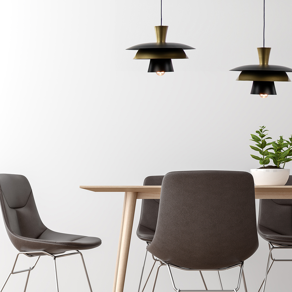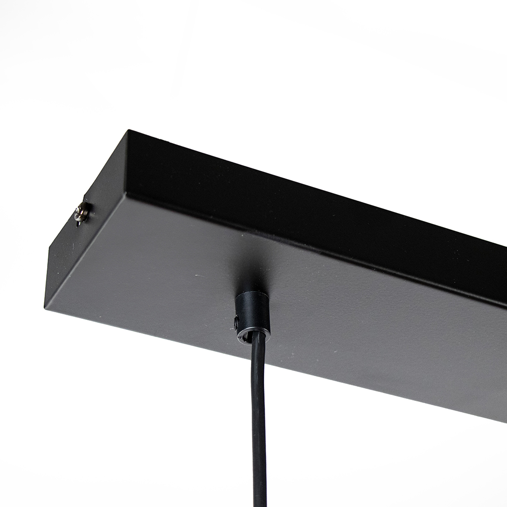 Een uitstekende hanglamp voor boven de eettafel. De lange plafondbevestiging met de 3 kappen geven nog meer lengte aan de eettafel. De hanglamp is uitgevoerd in een mat zwarte & gouden kleur en past mooi in een Industriële of landelijke woonstijl. Doormiddel van het snoer kunt u deze hanglamp eenvoudig in lengte verstellen.