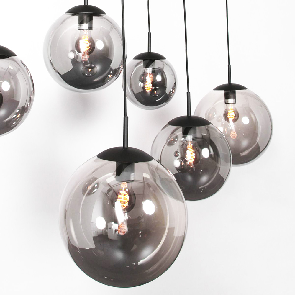 Kenmerken: 5 glazen bollen van rookglas in verschillende formaten Zwart metalen armatuur met langwerpige plafondplaat Ideaal voor boven eettafels of in hoge ruimtes zoals een trappenhal Geschikt voor E27 lichtbronnen (niet inbegrepen) Snoeren in hoogte verstelbaar bij installatie