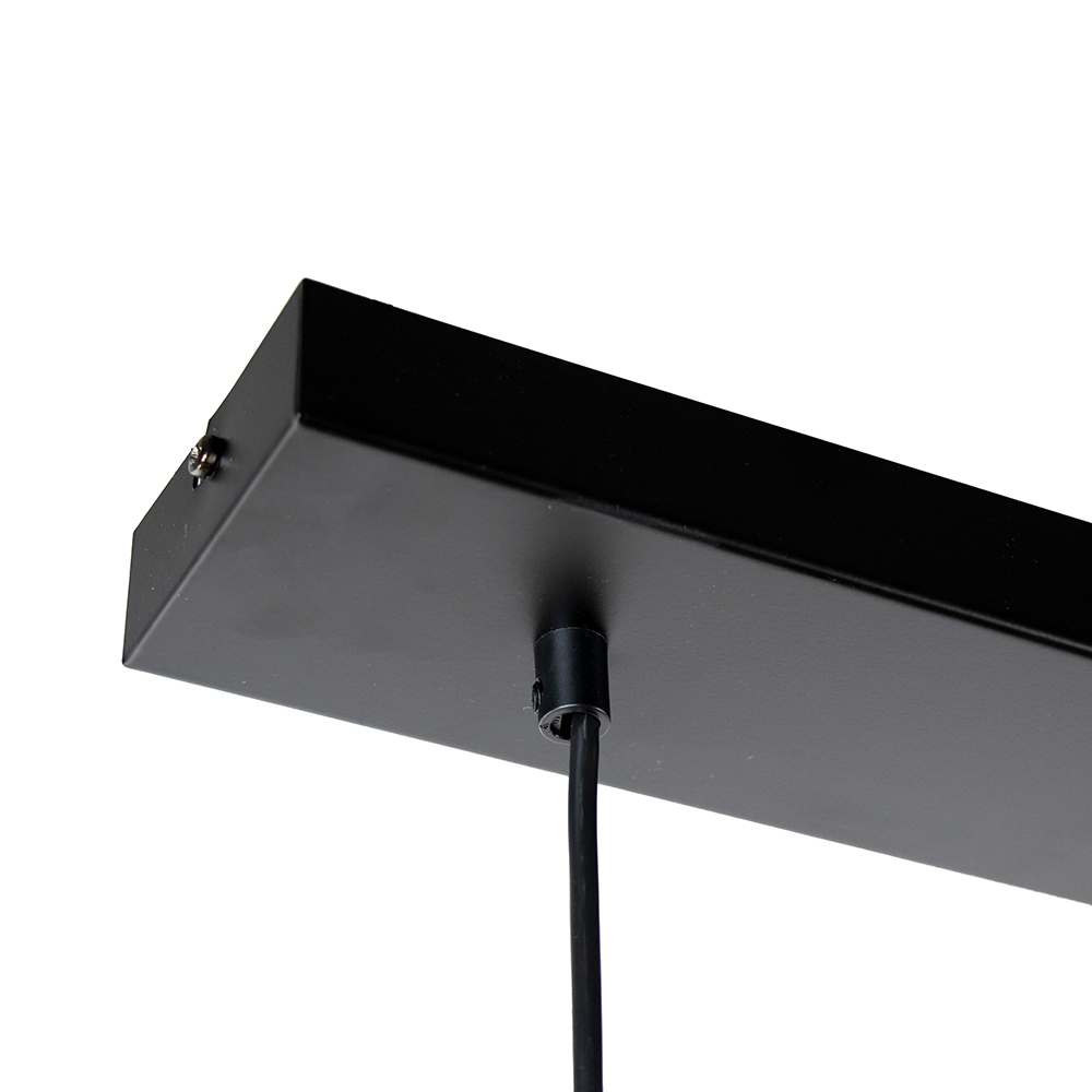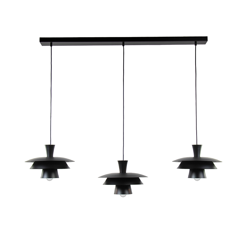 Details: – Afmetingen: 110x33x120 cm – Kap: ø33 x 21 cm – Plafondbevestiging: 8x110x3 cm – Kleur: mat zwart – Materiaal: metaal – Fitting: 3x E27 (Excl.)
