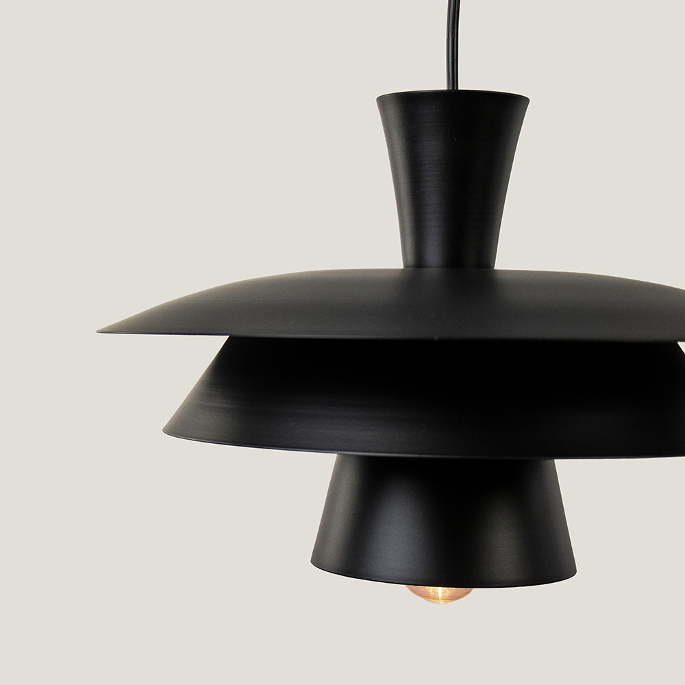Een uitstekende hanglamp voor boven de eettafel. De lange plafondbevestiging met de 3 kappen geven nog meer lengte aan de eettafel. De hanglamp is uitgevoerd in een mat zwarte kleur en past mooi in een Industriële of landelijke woonstijl. Doormiddel van het snoer kunt u deze hanglamp eenvoudig in lengte verstellen.