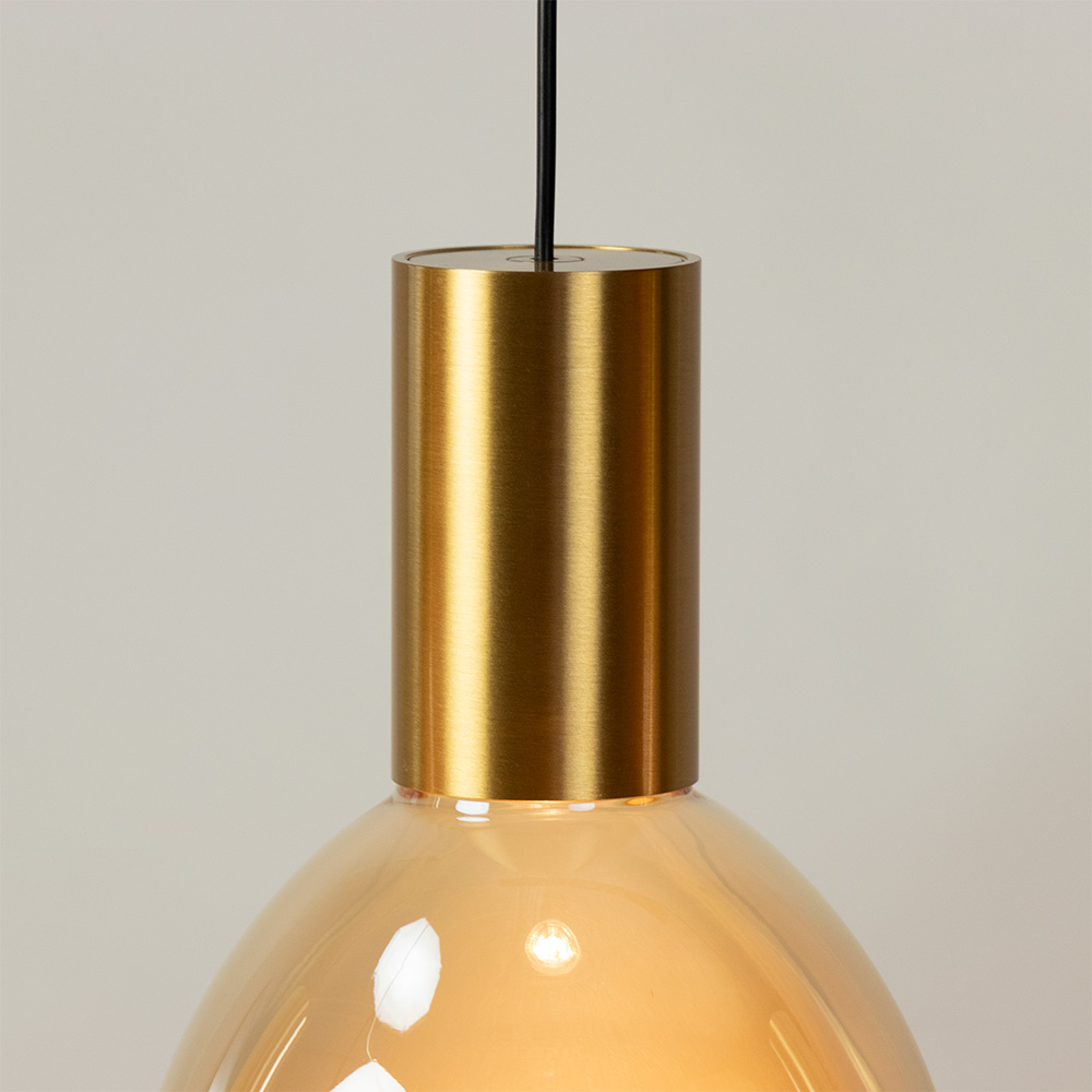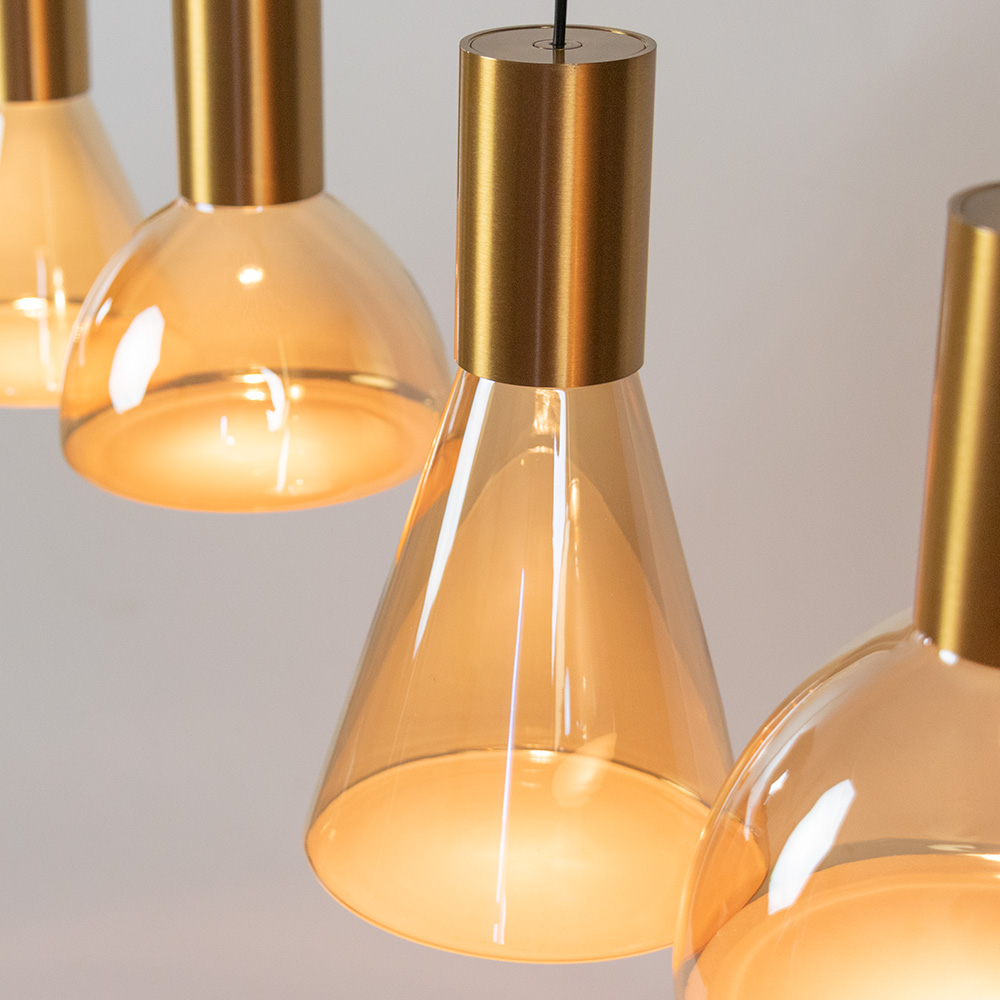 Met deze bijzondere hanglamp haal je een echte blikvanger in huis. Deze 9-lichts pendellamp combineert modern design met een warme, sfeervolle uitstraling. De goudkleurige metalen fittingen en amberkleurige glazen kappen vormen samen een stijlvol geheel dat perfect past boven een eettafel, kookeiland of in een vide. Wat deze lamp uniek maakt, is de variatie in kapvormen: de kappen hebben per twee een eigen silhouet, wat zorgt voor een speels maar harmonieus effect. De zachte, warme gloed die het amberkleurige glas verspreidt, creëert direct sfeer in de ruimte. Door de lange kabels is deze lamp ideaal voor in een vide of boven de tafel in een kamer met hoog plafond