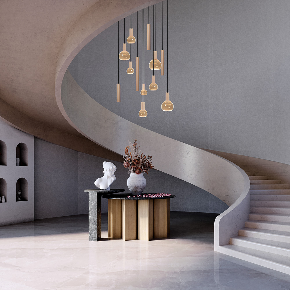 Deze prachtige vide-/hanglamp past perfect in een design of luxury interieur. De hanglamp is uitgevoerd in het quartz en is voorzien van een ronde plafondplaat van ø100 cm. Ideaal voor in een ruimte met een hoog plafond of trappenhuis. De hanglamp heeft 12 lichtpunten waarvan er 7 een pendel met E27 fitting hebben en 4 een cilinder met een GU10 fitting. De samenwerking van de pendels en cilinders zorgen voor een goede lichtverspreiding waarbij extra diffuus licht en sfeer niet ontbreken. De hanglamp is naar wens in hoogte te verstellen met een maximale hoogte van 350 cm.