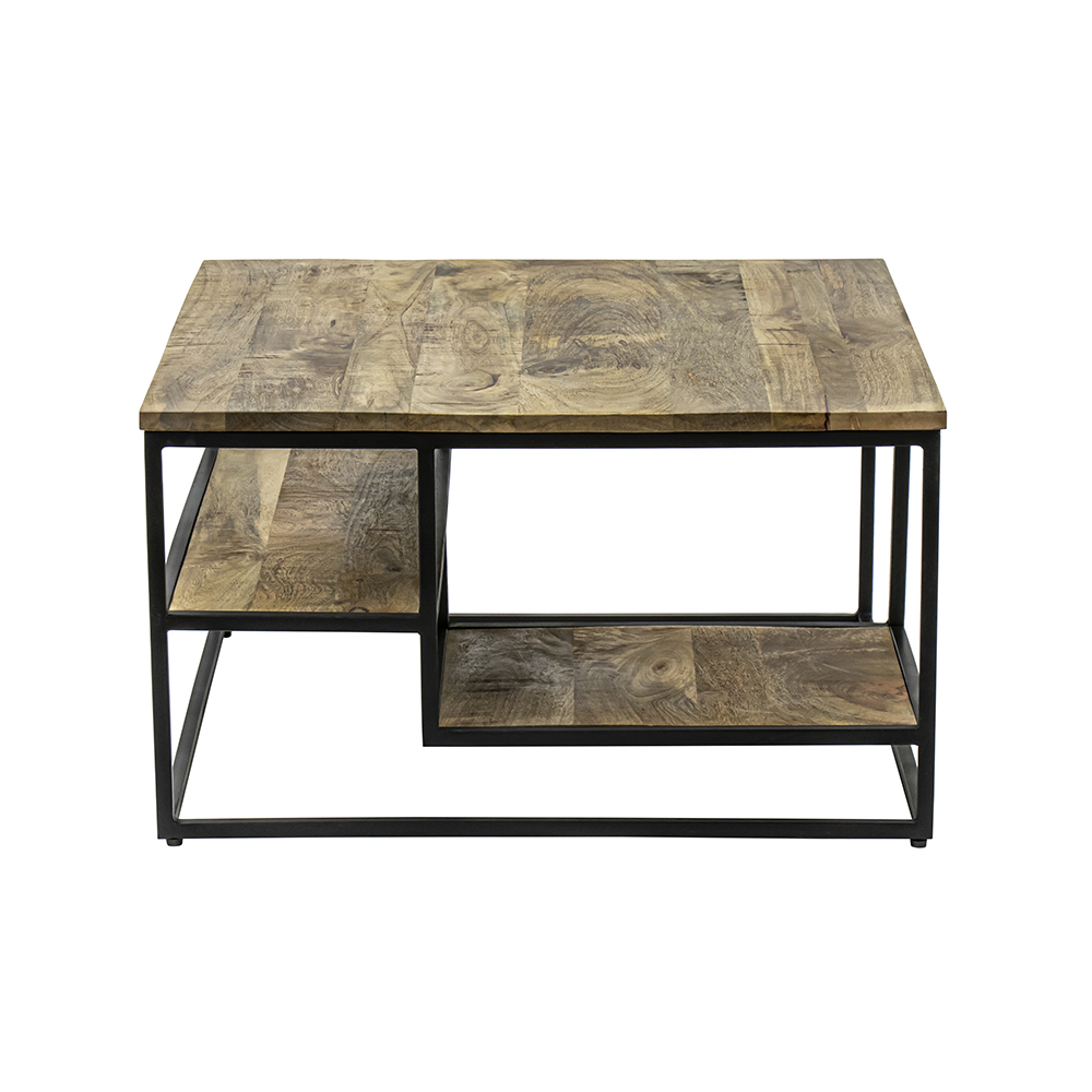 Salontafel van mangohout met een mat zwart metalen frame. De tafel heeft 2 planken onder het tafelblad op verschillende hoogtes. Dit geeft de tafel een speels uiterlijk. De salontafel is een echte eyecatcher met een luxueuze uitstraling. Het tafelblad is behandeld en beschermd. Deze kan worden afgenomen met een vochtige doek.