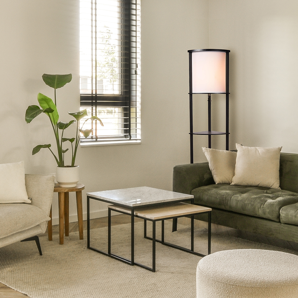 Deze sfeervolle vloerlamp is gemaakt van hoogwaardig mdf en uitgevoerd in het mat zwart. Dit is mooi gecombineerd met een beige kantoenen kap die zorgt voor diffuus licht in de ruimte. Door de driehoekige vorm is de vloerlamp perfect toe te passen in een lege hoek in de kamer. De plankjes zijn prima geschikt om wat leuke accessoires, plantjes of boeken op neer te zetten. De zwarte vloerlamp met kap is voorzien van een snoer met een lengte van 180 cm en wordt gemakkelijk aan en uit geschakeld dmv de nostalgische trekschakelaar onder de kap.