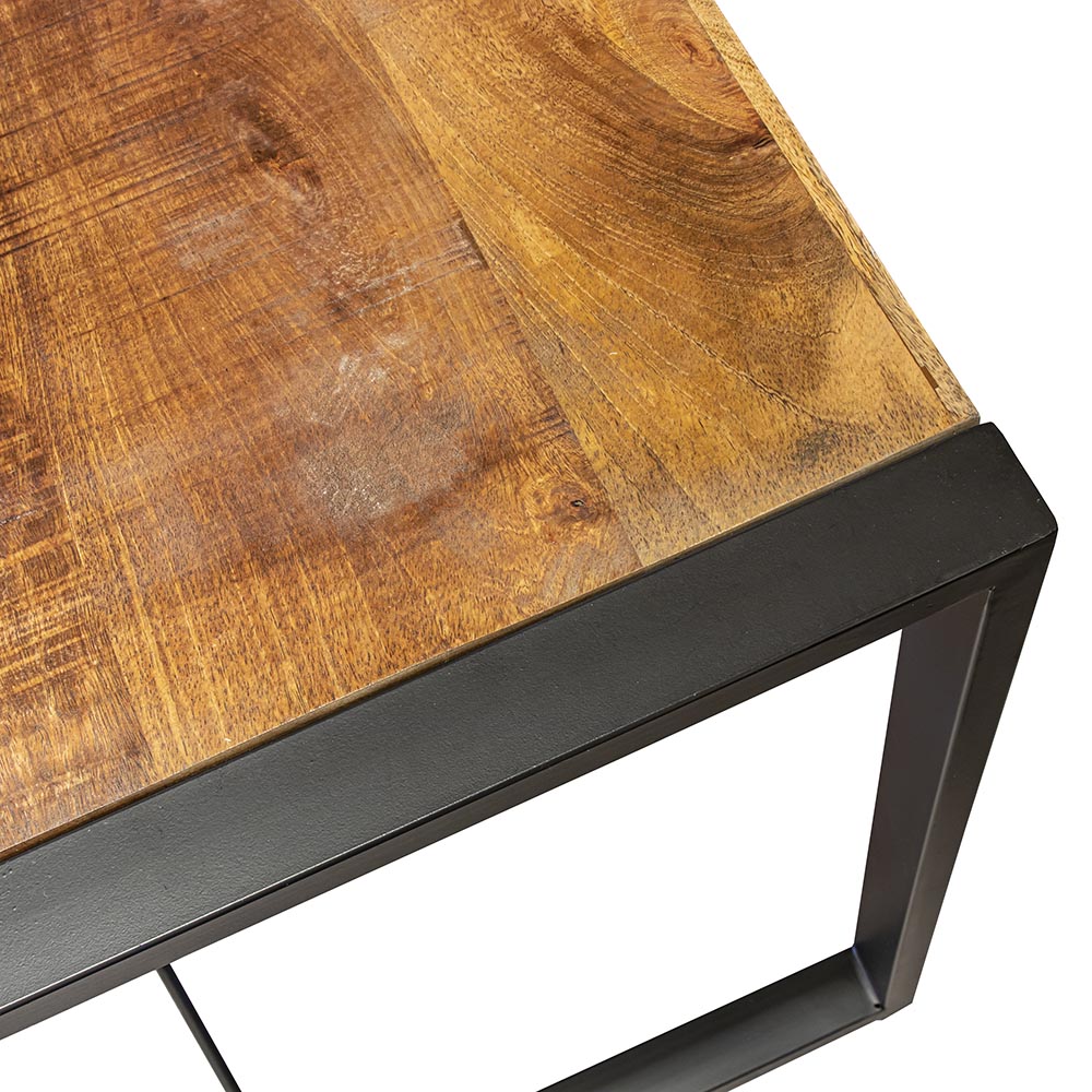 Een stoere eettafel met industriële details. De rechthoekige eettafel heeft een afmeting van 160×90 cm en is voorzien van een mango houten blad. Deze wordt ondersteund door mat zwarte metalen poten die door een schakel zijn bevonden. Het mango houten blad heeft een dikte van 7,5 cm maar is niet massief. De eettafel is fijn toe te passen in een wat kleinere ruimte en biedt genoeg ruimte voor 4 stoelen.