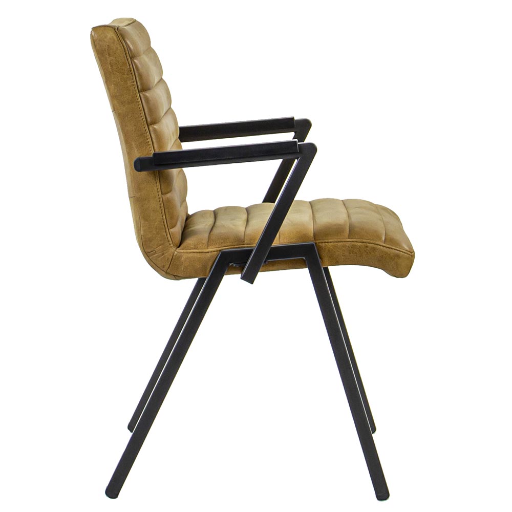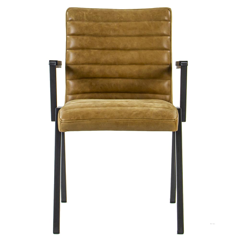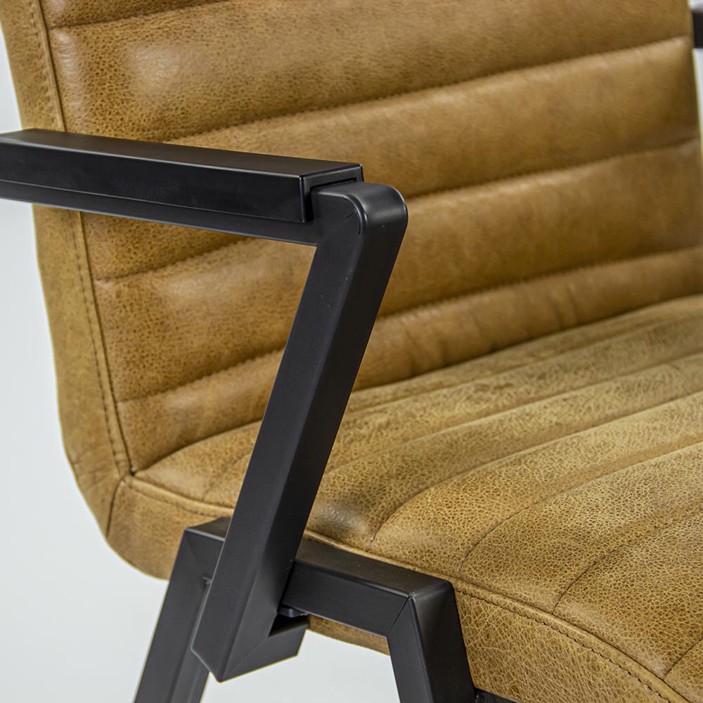 Deze prachtige eetkamerstoel heeft een hedendaags modern ontwerp en is voorzien van een zeer comfortabele en stevige zitting. Deze luxe stoel met armleuningen is geliefd vanwege zijn stoere en robuuste uitstraling. Dit model eettafelstoel kan ook worden gebruikt in de slaapkamer of in een studeerkamer en past vrijwel in elke woonstijl. Het fraaie design van de stoel maakt deze een echte eyecatcher in uw interieur. De armleuningen zijn voorzien van een kunststof armsteun, deze beschermen het zwarte metaal en voelen veel comfortabeler aan dan het vaak koude metaal. De zitting is uitgevoerd in leer met strakke horizontale stiksels. Echt een stoel om lekker lang en comfortabel op te vertoeven. Ideaal om gezellig lang te tafelen, borrelen of te werken! De stoel heeft een modern industrieel karakter.