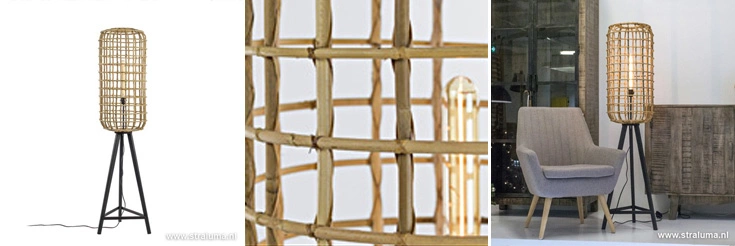 Botanische prints, groen en natuurlijke materialen zijn hot. De driepoot landelijk rotan kooi is een vloerlamp die perfect in deze interieur LOVE-kleuren past. De zwarte driepoot geeft een mooi contrast met de rotan kooi. Prachtig in uw woonkamer of uw slaapkamer.
