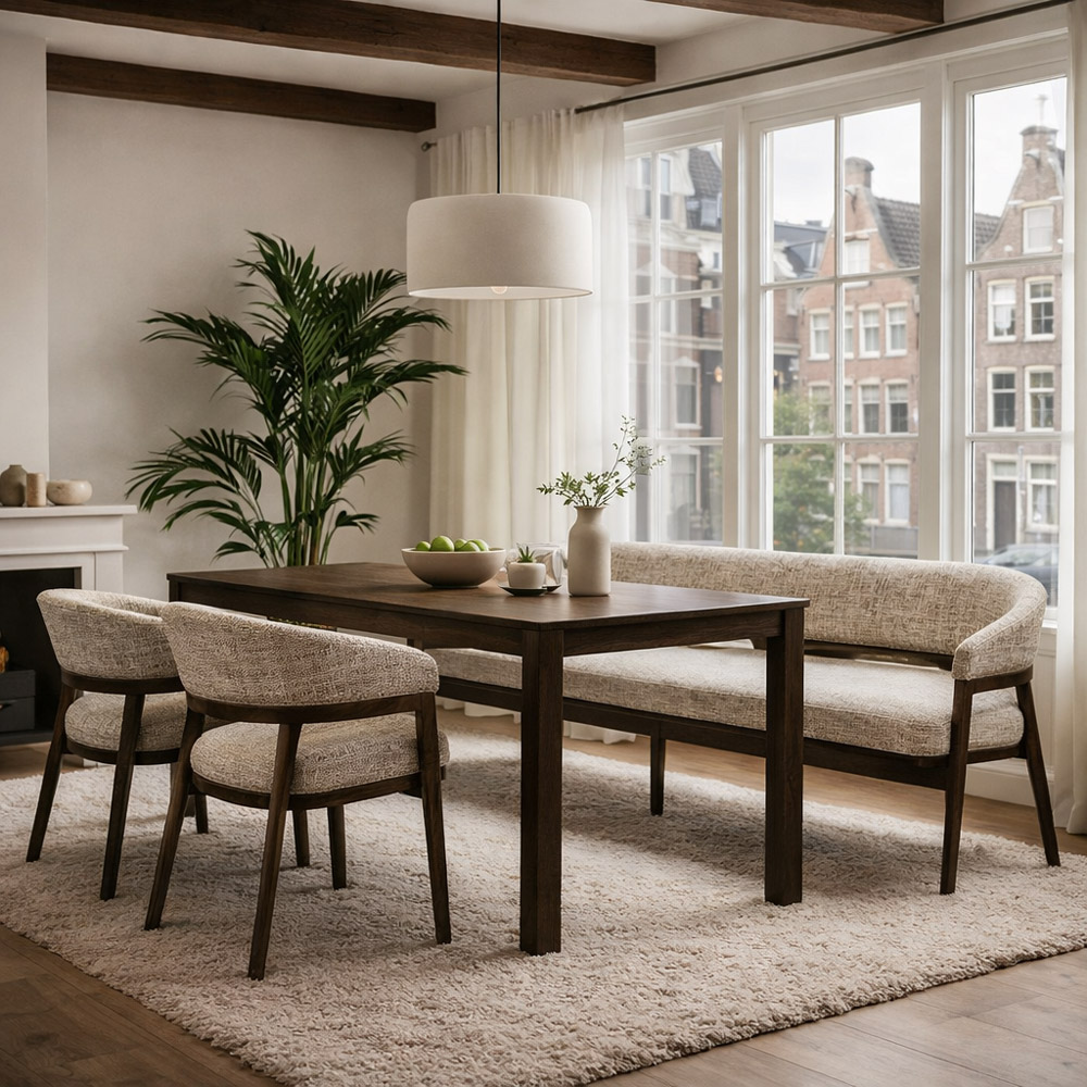 De licht gebogen rugleuning en royale zitting maken deze bank ideaal voor lange, gezellige diners. Door een eetkamerbank te combineren met stoelen creëer je een speels en luchtig geheel aan tafel. Perfect voor een eettafel van circa 220–260 cm.