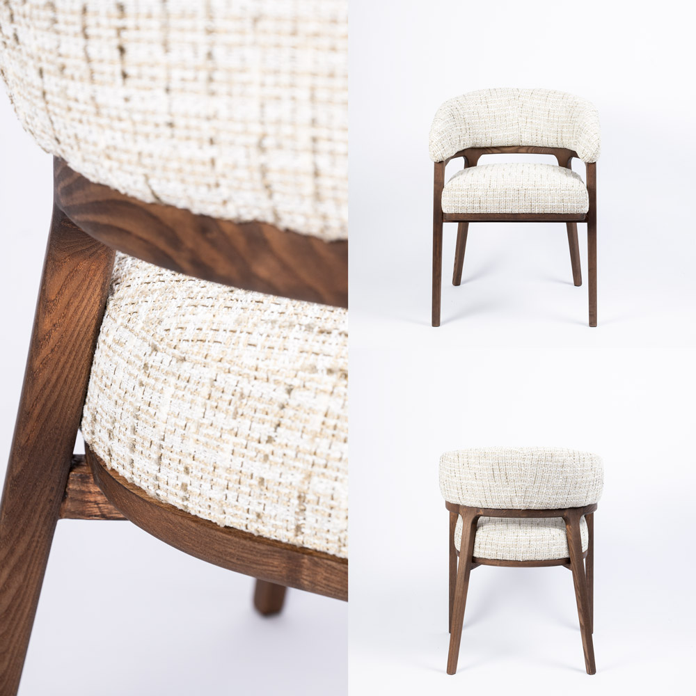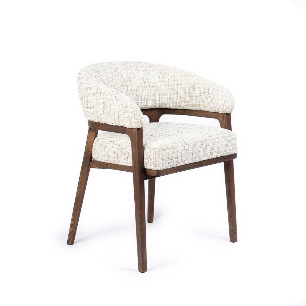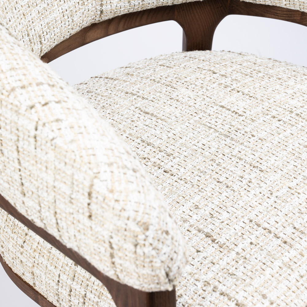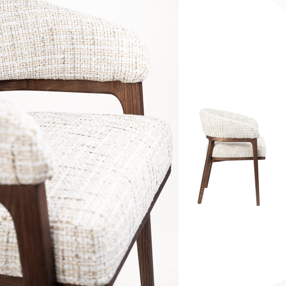 Highlights • Elegante eetkamerstoel met armleuningen • Bekleed met luxe “Be Trendy” stof (Eurotex) • Warme combinatie van beige stof en walnoot houten frame • Comfortabele zitting met zachte, afgeronde vormen • Perfect te combineren met de Dory eetkamerbank