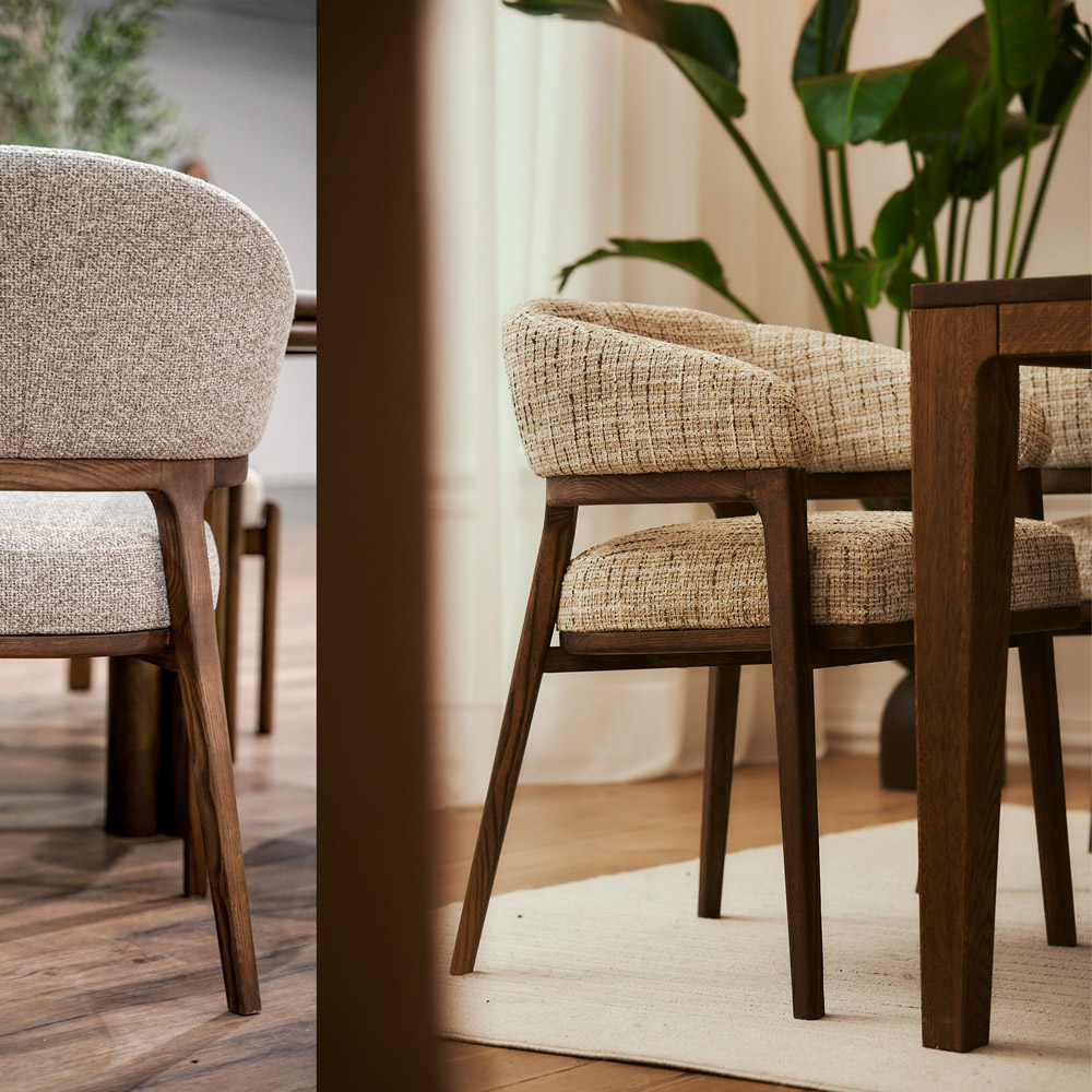 De afgeronde rugleuning met geïntegreerde armleuningen biedt extra comfort tijdens lange diners. Dankzij het verfijnde lijnenspel en de hoogwaardige afwerking past deze stoel perfect in moderne, Japandi en Scandinavische interieurs. Combineer de stoel met de Dory eetkamerbank voor een speels en harmonieus geheel aan de eettafel.