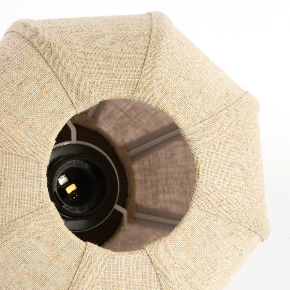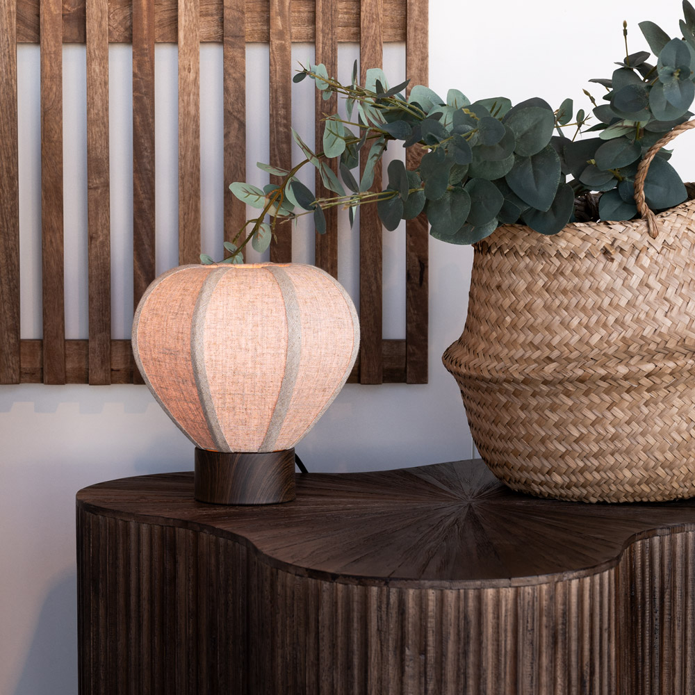 • Japandi tafellamp met zachte organische vorm • Linnen lampenkap voor warm en sfeervol licht • Houten voet voor een natuurlijke uitstraling • Compact formaat, perfect voor dressoir, nachtkastje of vensterbank • E27 fitting – lichtbron naar keuze