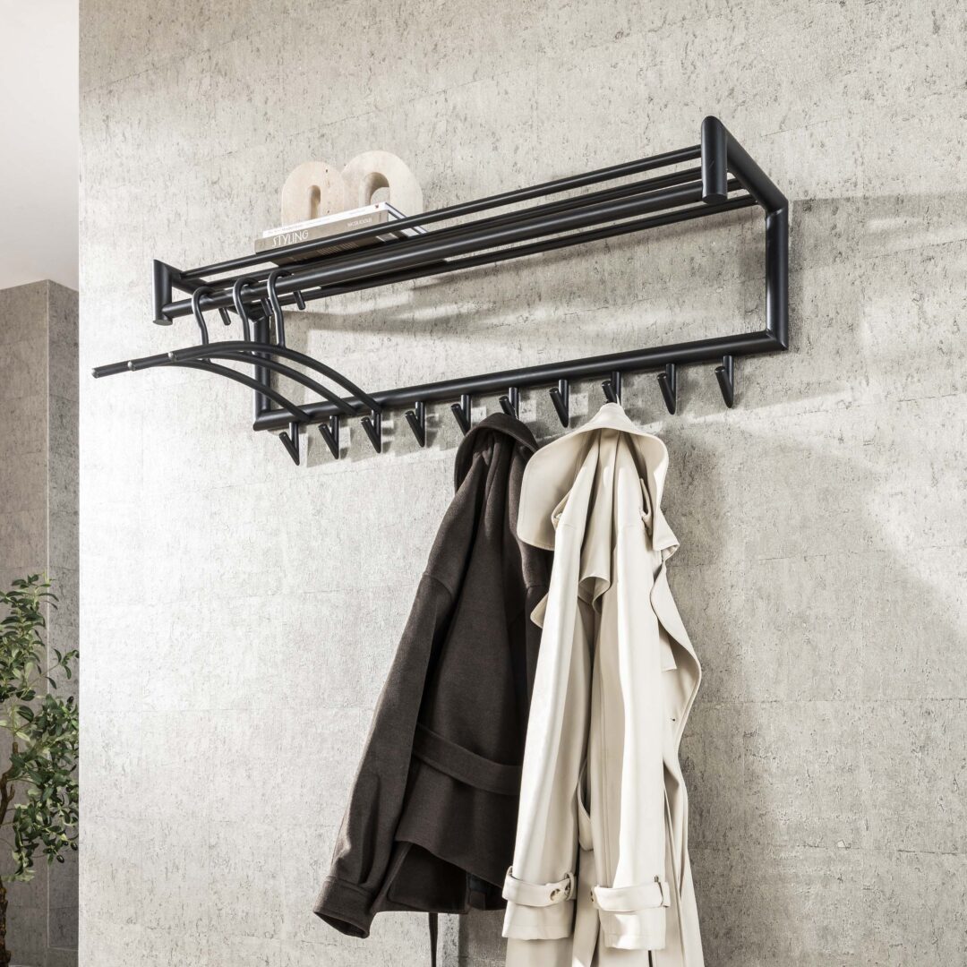 Strak, modern en bijzonder functioneel. De Kapstok Tubo 10H is uitgevoerd in mat donkergrijs metaal en biedt dankzij zijn slimme ontwerp meer dan alleen haken. Bovenaan bevindt zich een stevige hoedenplank/legplank, ideaal voor mutsen, sjaals of tassen. Daaronder loopt een metalen stang waarop je kledinghangers kunt plaatsen — perfect voor mantels, colberts of delicate kledingstukken die je liever niet aan een haak hangt.